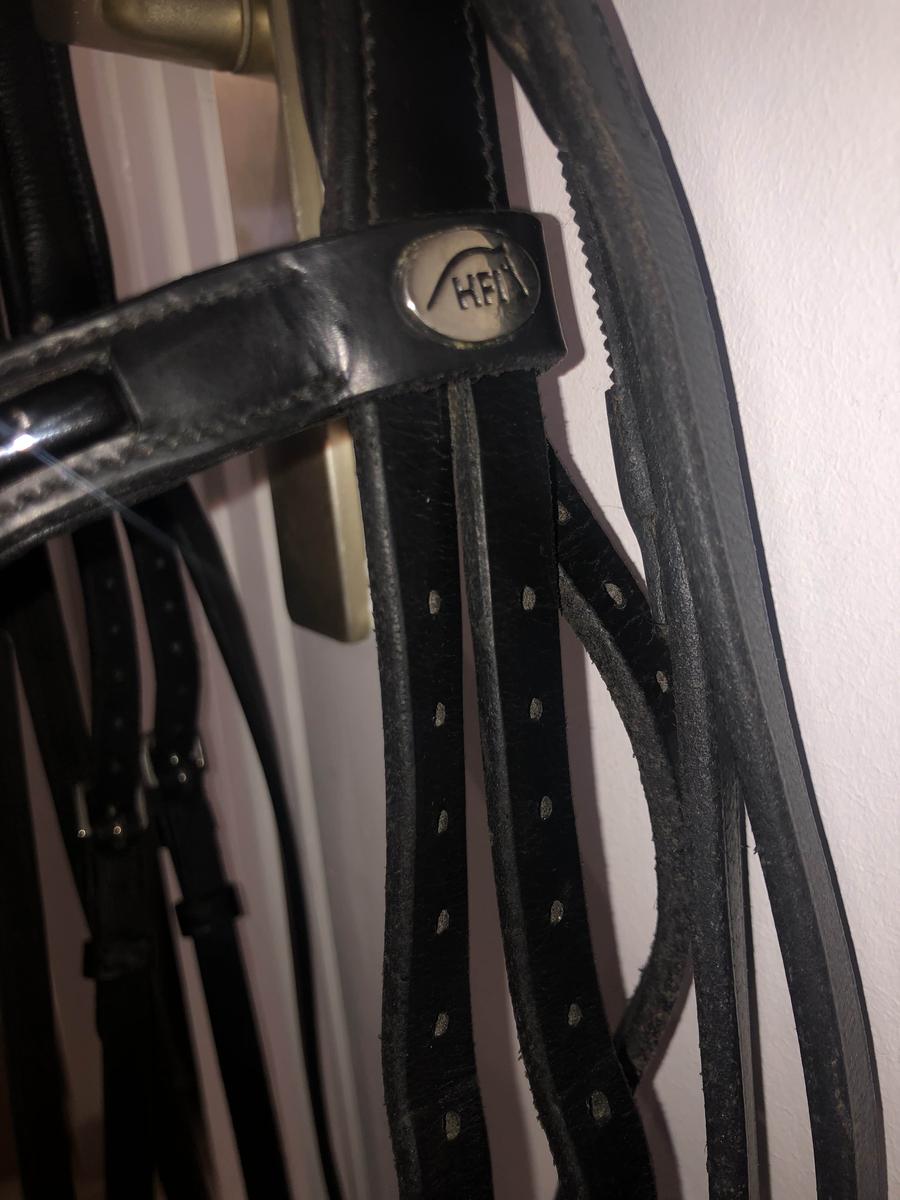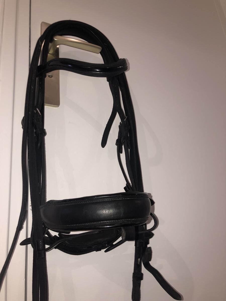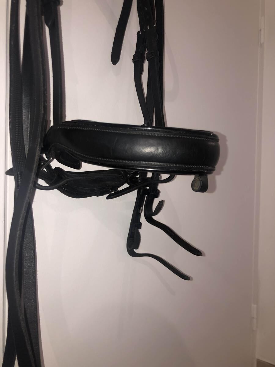 Têtière anatomique rembourrée et doublée de cuir souple. Frontal anatomique avec liseré laqué, rembourré et doublé de cuir souple. Large muserolle ornée de fin liserés laqués, avec découpe anatomique, rembourrée et doublée de cuir souple. Rênes avec arrêtoirs en cuir.