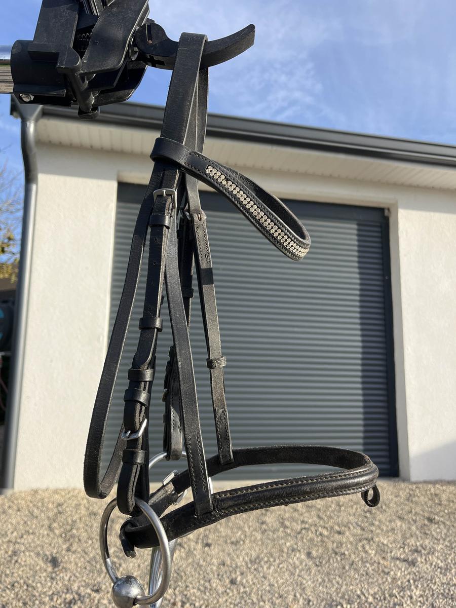 Filet Fouganza avec frontal à strass taille poney pas mal servi mais reste en très bon état manque un strass sur le côté (voir dernière photo) vendu sans le mors