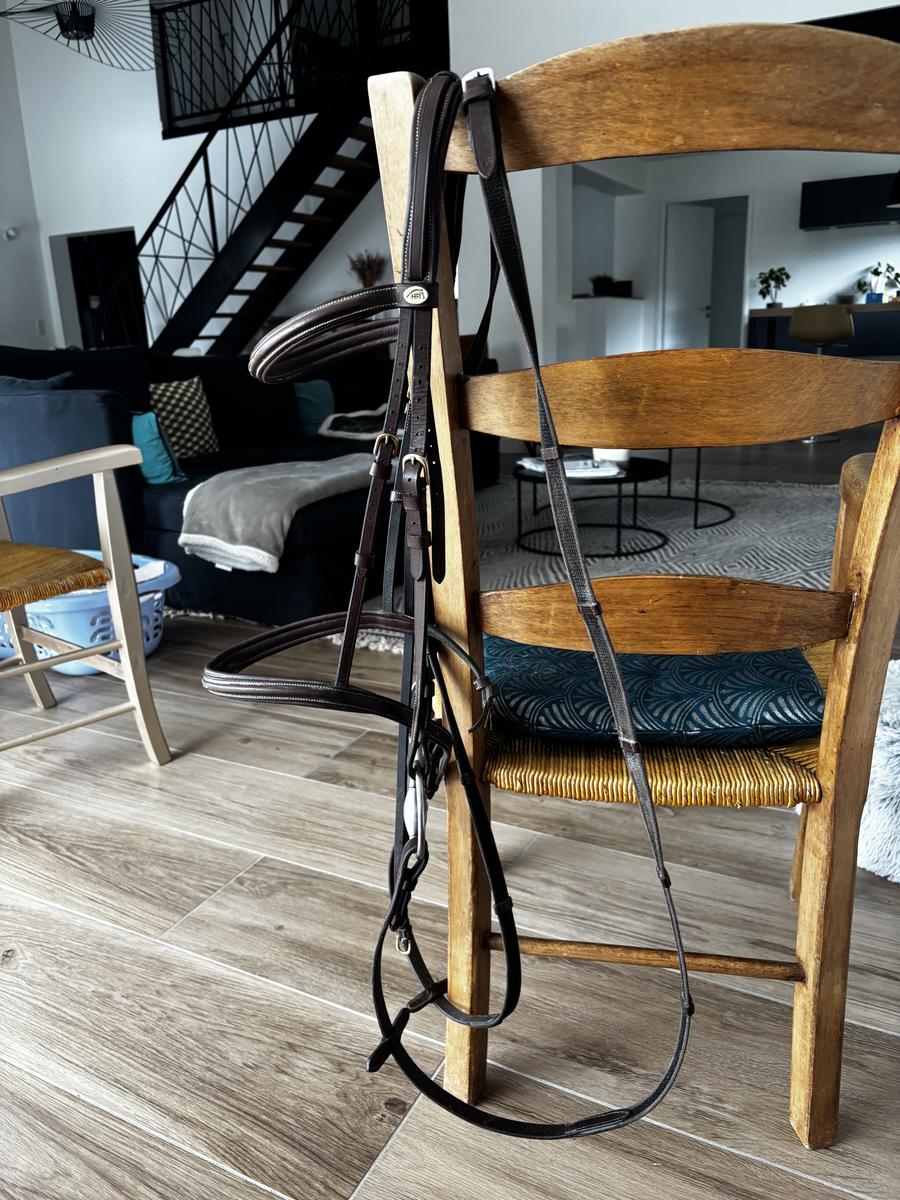 Filet HFI en taille COB de couleur Havane, vendu avec deux nosebands, le mors et les rênes.
