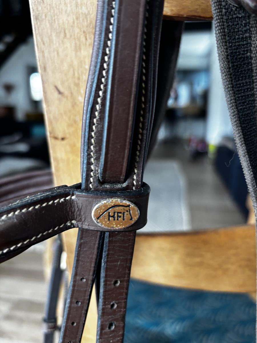Filet HFI en taille COB de couleur Havane, vendu avec deux nosebands, le mors et les rênes.