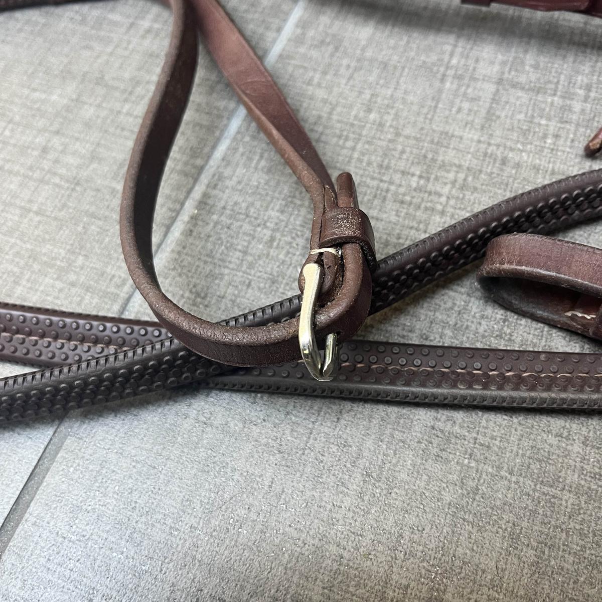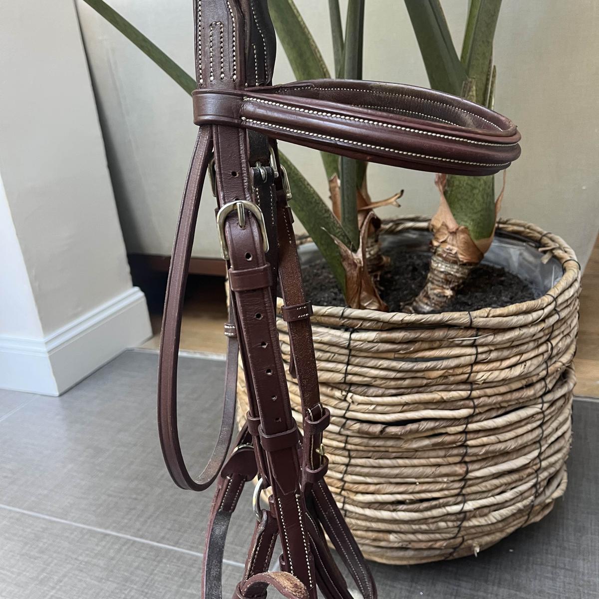 Taille Cheval. Cuir couleur havane. Marque : PESSOA. Têtière avec dégagement des oreilles. Muserolle croisée avec mouton. Bouclerie dorée. Stitching blanc. Vendu avec paire de rênes caoutchouc de la même couleur. Bon état.