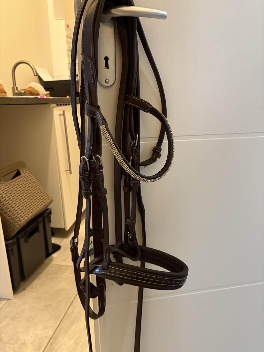 couleur havane taille cheval vendu avec renes et noseband en tres bon etat car porté uniquement en concours