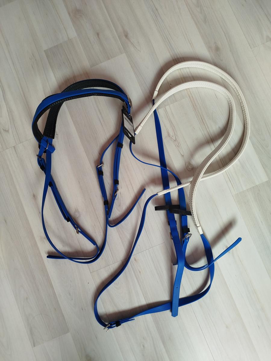 Bridon (sans muserolle) et rênes bleu roi en PVC. Ensemble neuf sans étiquette. Idéal pour la pratique de l'endurance.