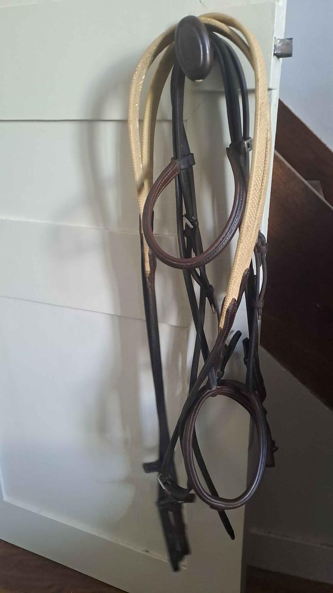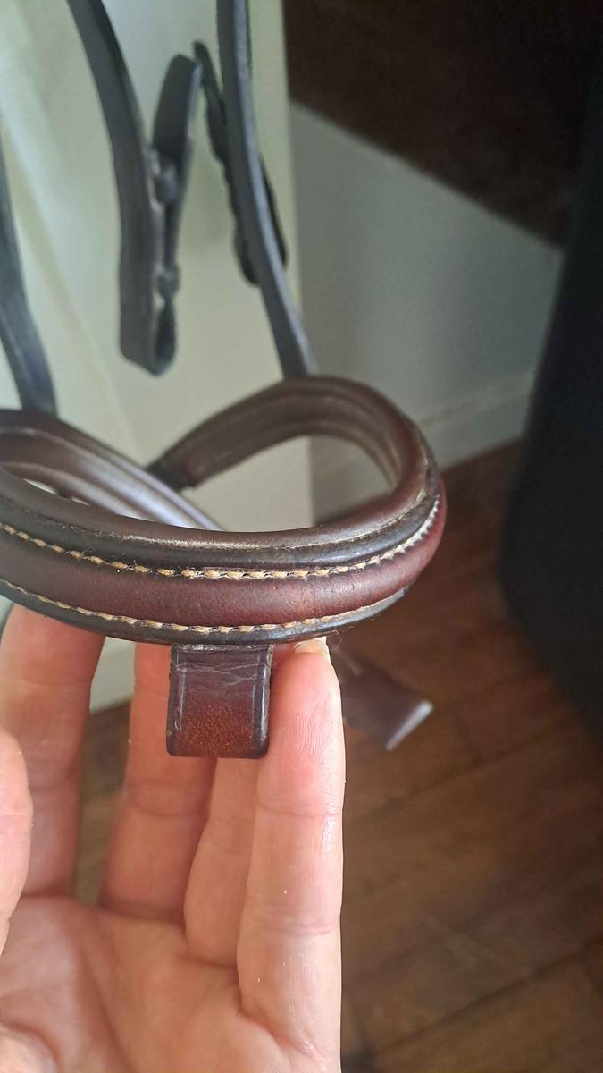 Filet Stubben cuir souple d'excellente qualité, utilisé mais toujours entretenu. Double attache au frontal style très élégant. Vendu avec les rênes d'origines toujours utilisable mais le caoutchouc a moins de grip.