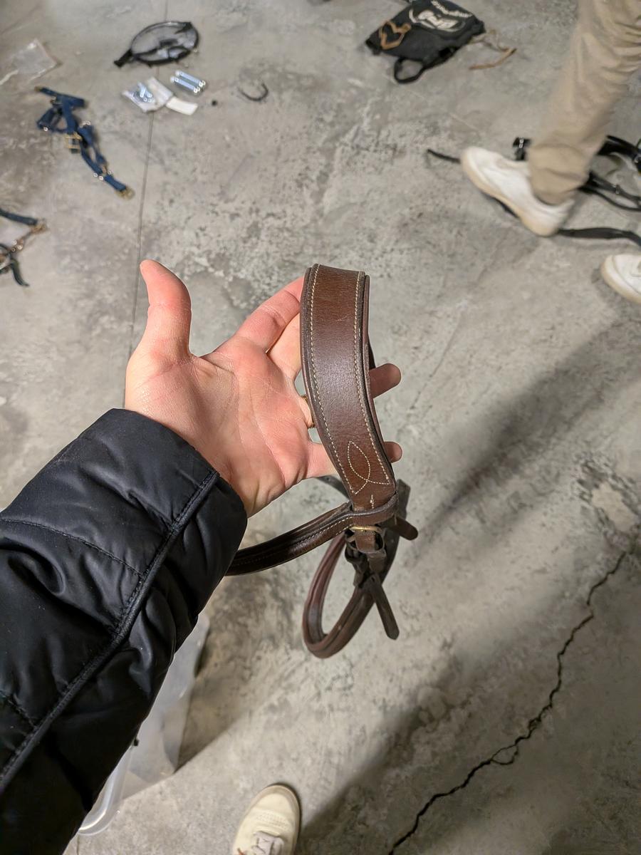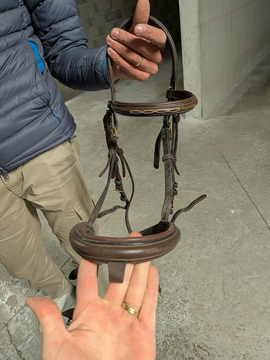 Filet cuir marron simple avec des surpiqures sur le frontale et têtière incurvé pour être anatomique.