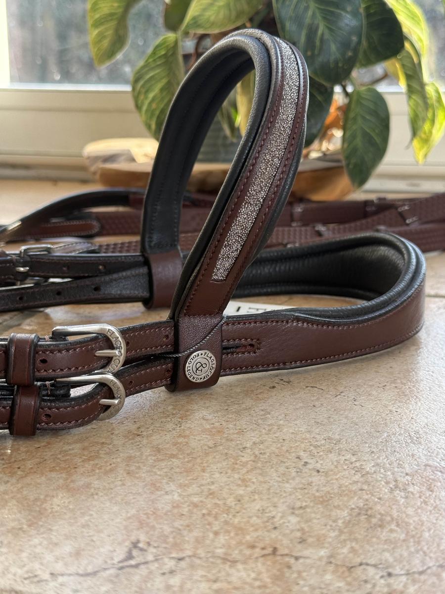 Ce bridon est accompagné de son noseband et sa paire de rênes en caoutchouc (avec des arrêtoirs).