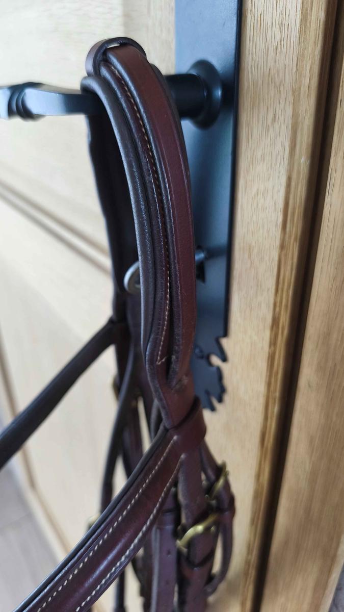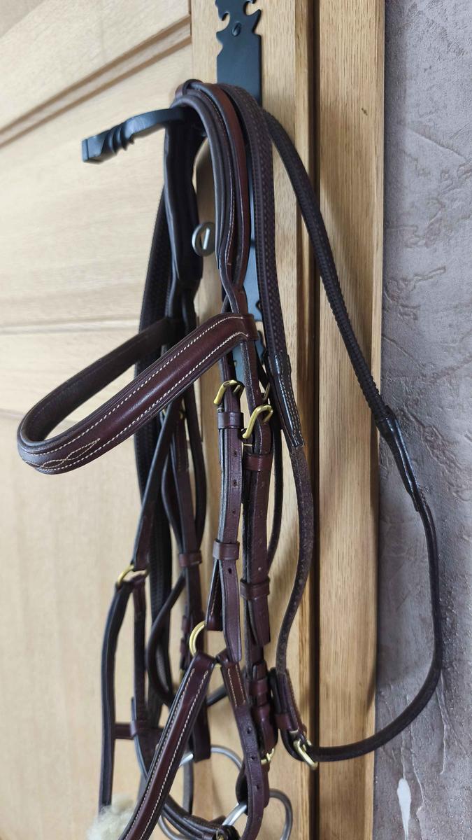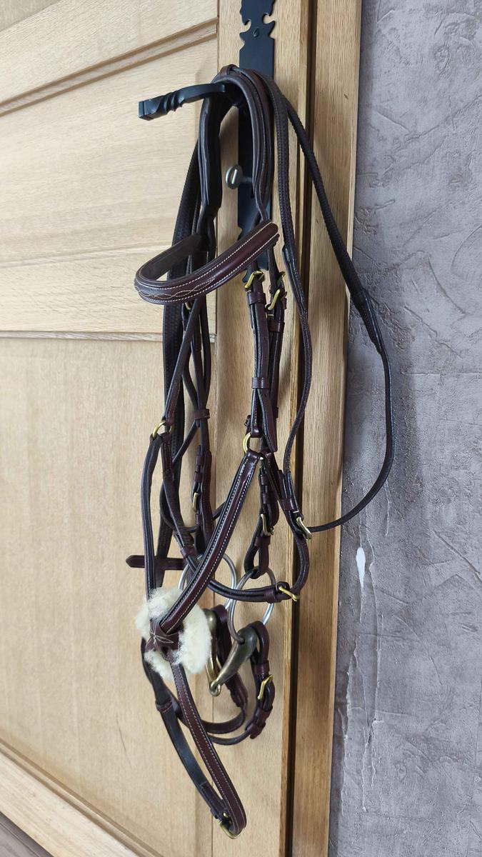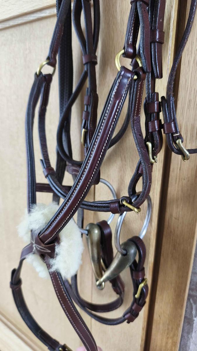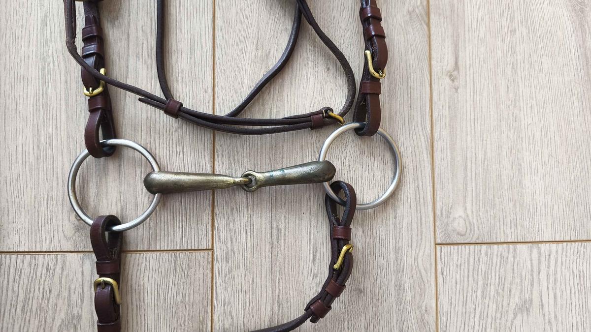 Filet en cuir couleur havane avec muserolle croisée - Taille cheval - Mors simple brisure gros canons 16cm - Rênes antidérapantes - Très bon état !