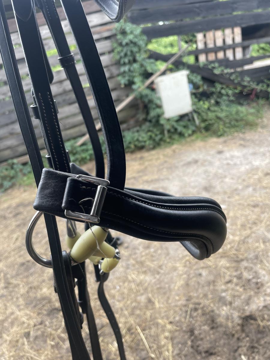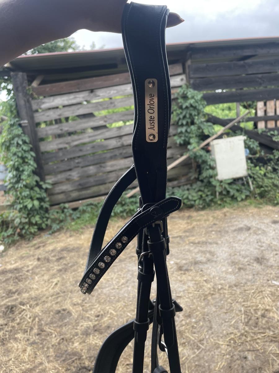Bridon en cuir noir de chez Smart Wag, avec plaque gravé au niveau de la têtière (actuellement gravé au nom de mon cheval, qui ne pose pas de problème car plaque amovible et donc modifiable)