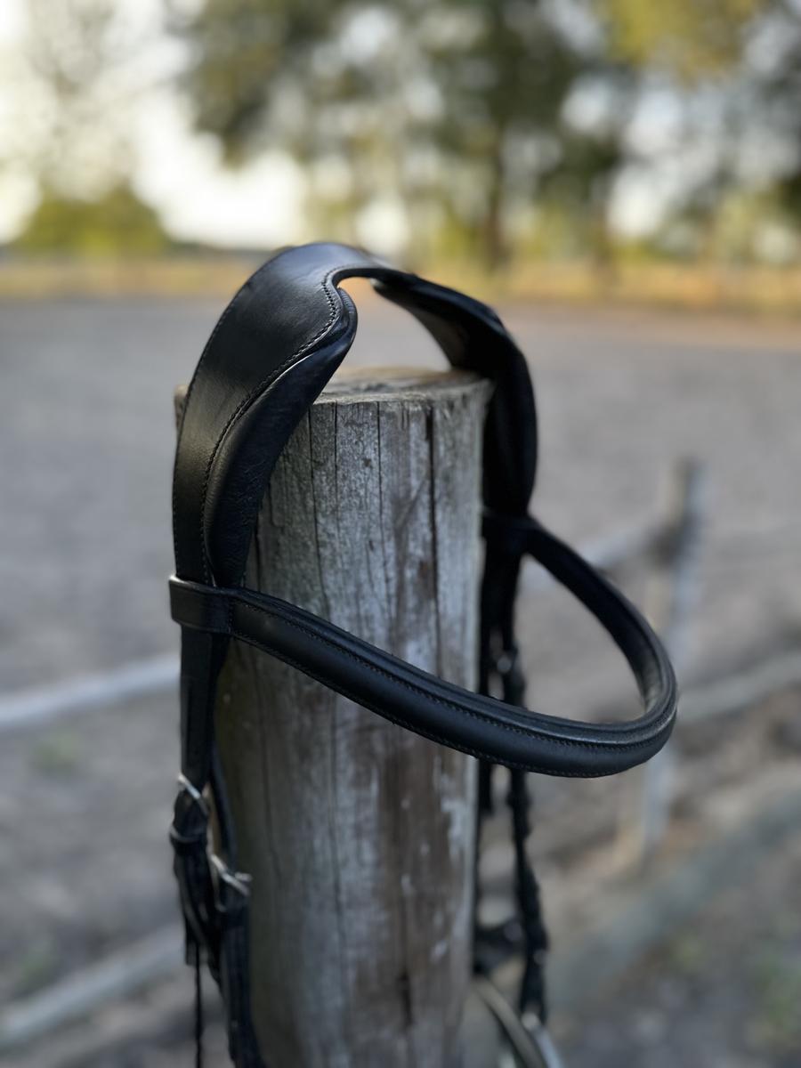 Bridon marque Kramer avec têtière imitation Antares. Muserolle pull back Kramer également et frontal de marque Privilege Equitation.