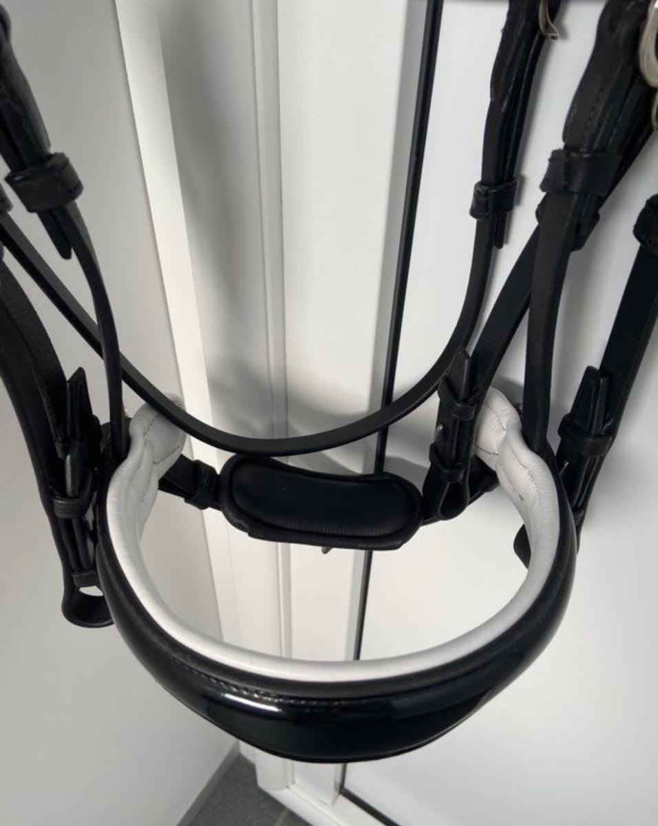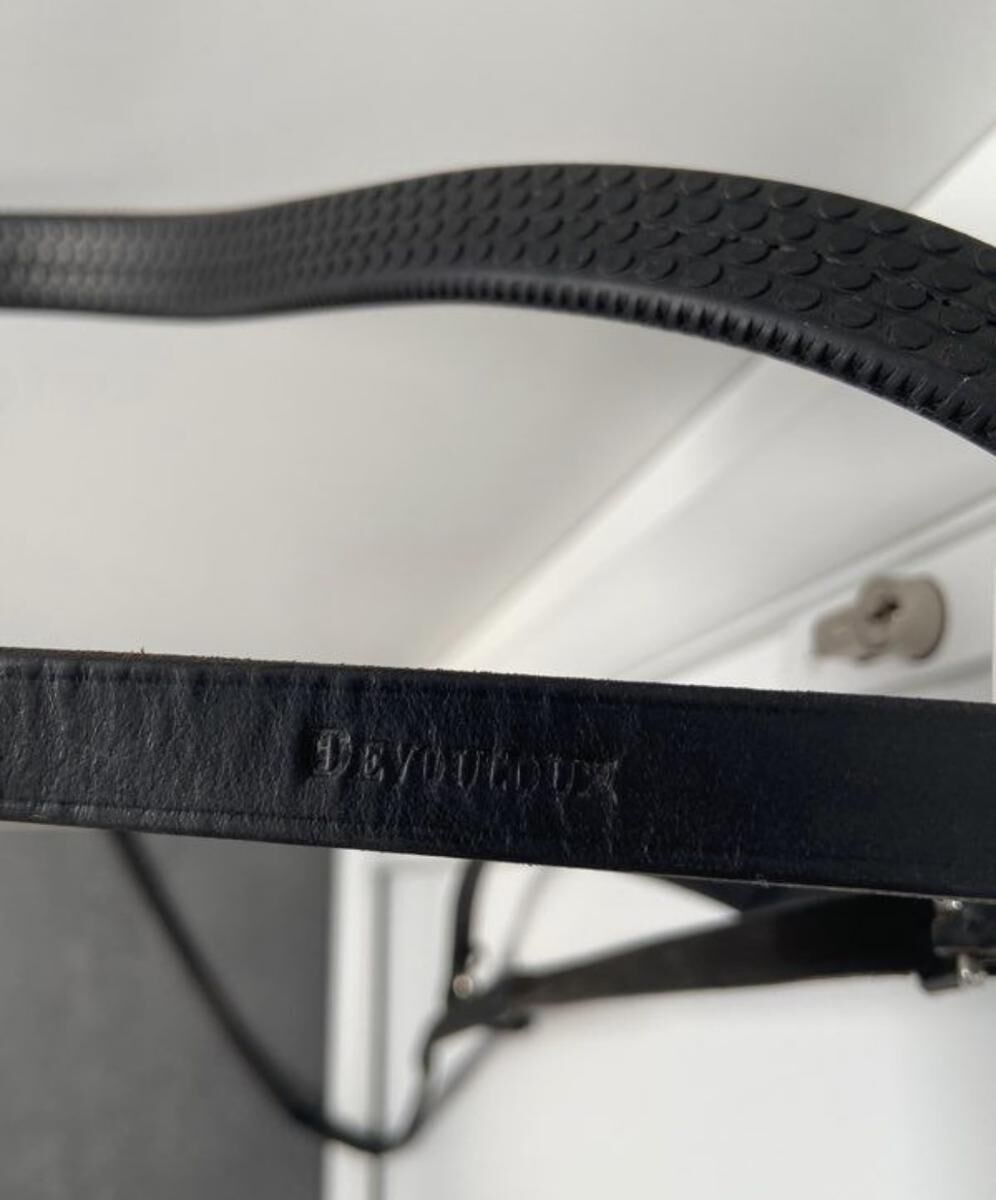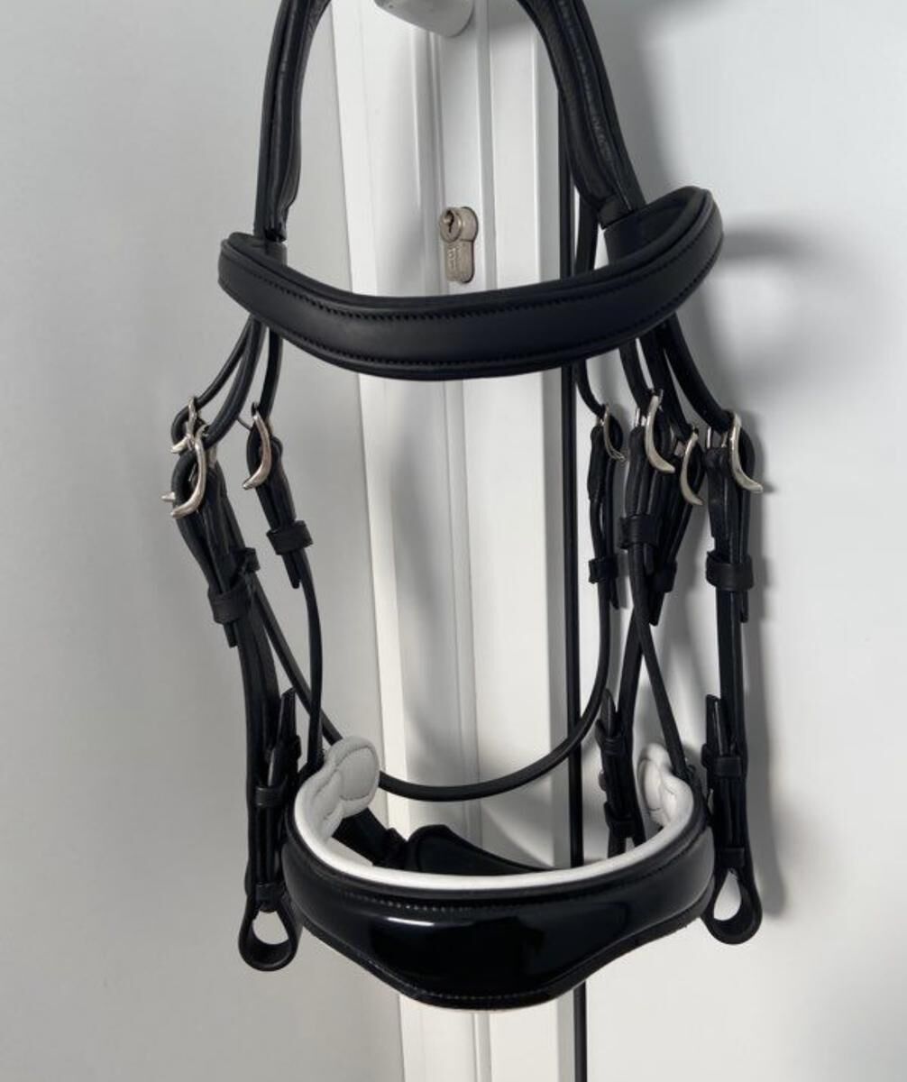 Je vends une bride Antarès dans un état irréprochable comme neuf, elle a servi 2-3 fois, nettoyé à chaque utilisation et huilé une fois, elle est même encore un peu raide du fait qu’elle est neuve comme vous pouvez le voir sur la photo. Je la vend avec une paire de renes noir devoucoux et son sac à bride antares.