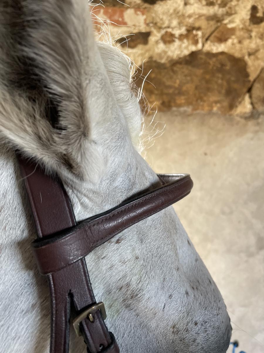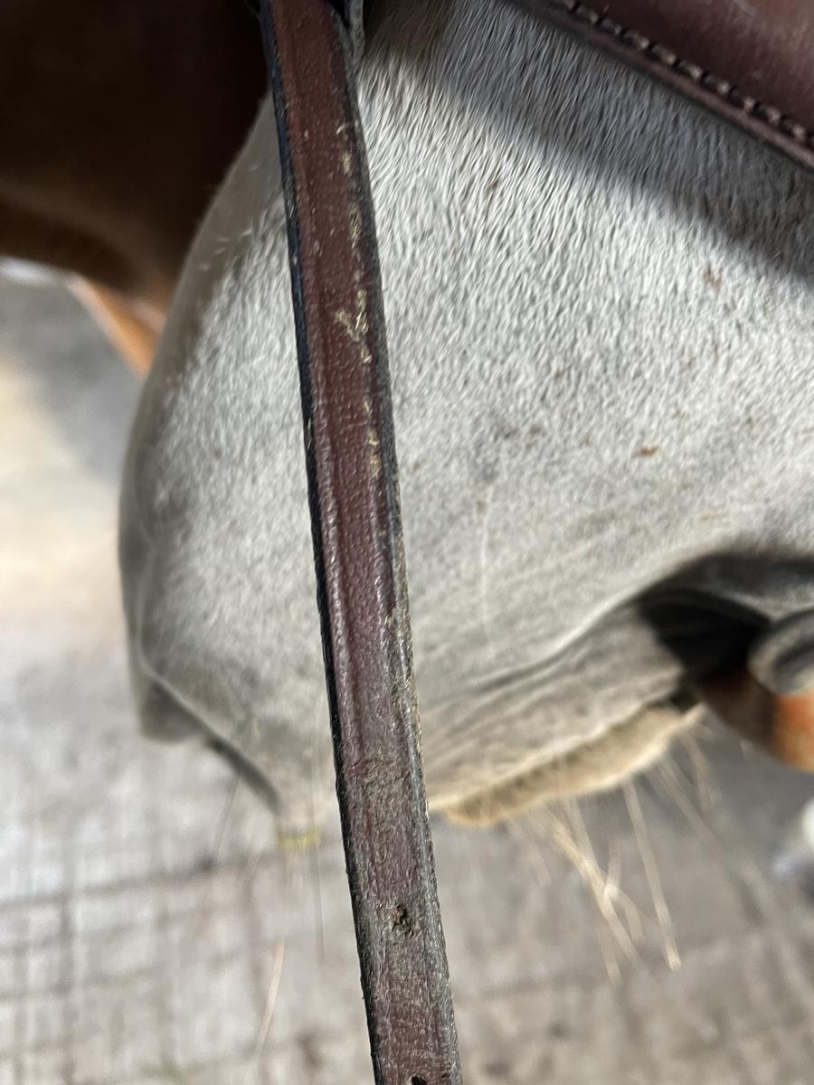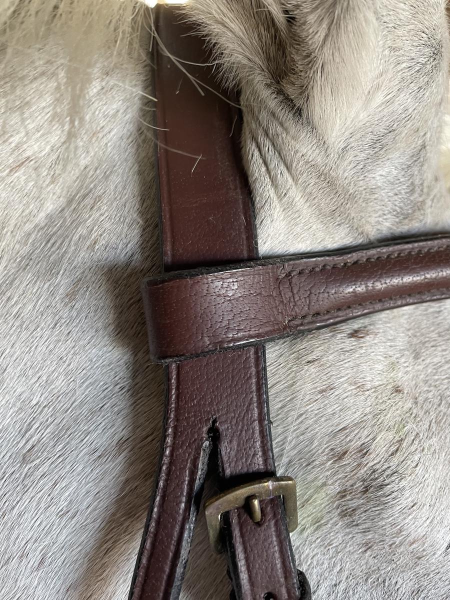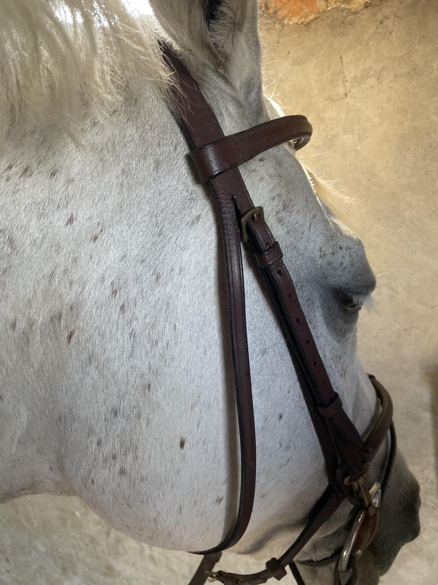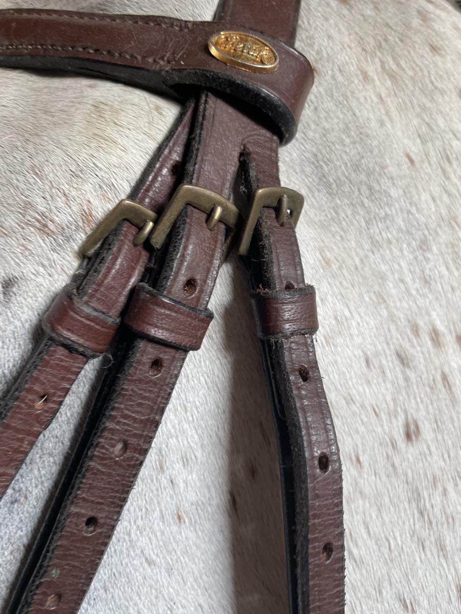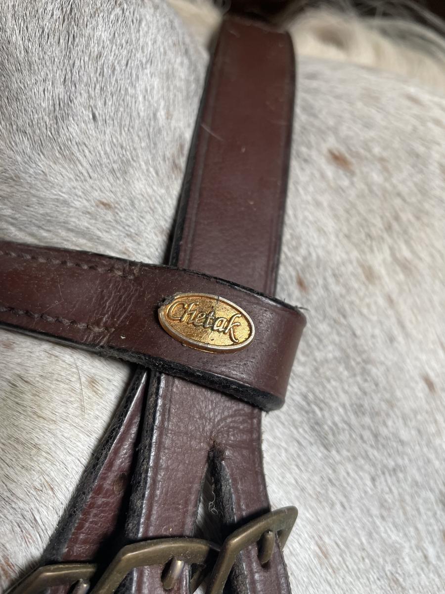 Vieux modèle de chez chetak (+ de 20/25ans) havane taille cheval peut convenir à un poney D (photo du gris) comme à un cheval de + d’1m75 ( photo du bai). Malgré une griffure sur la muserolle filet en très très bonne état, frontal droit, possibilité d’enlever le noseband grâce à la pièce de cuir. Têtière NON anatomique. VENDU SANS MORS ET SANS RÊNES. Prix négociable dans la limite du raisonnable.