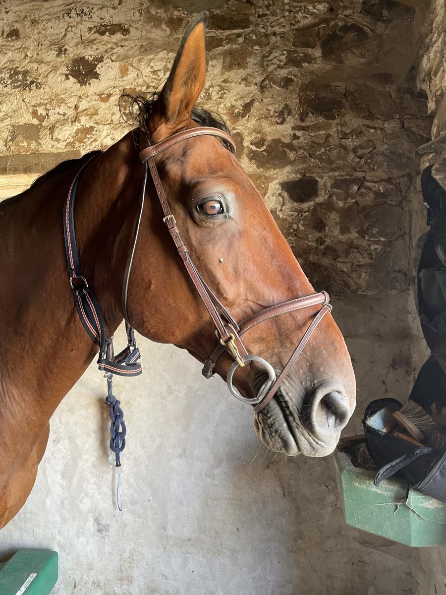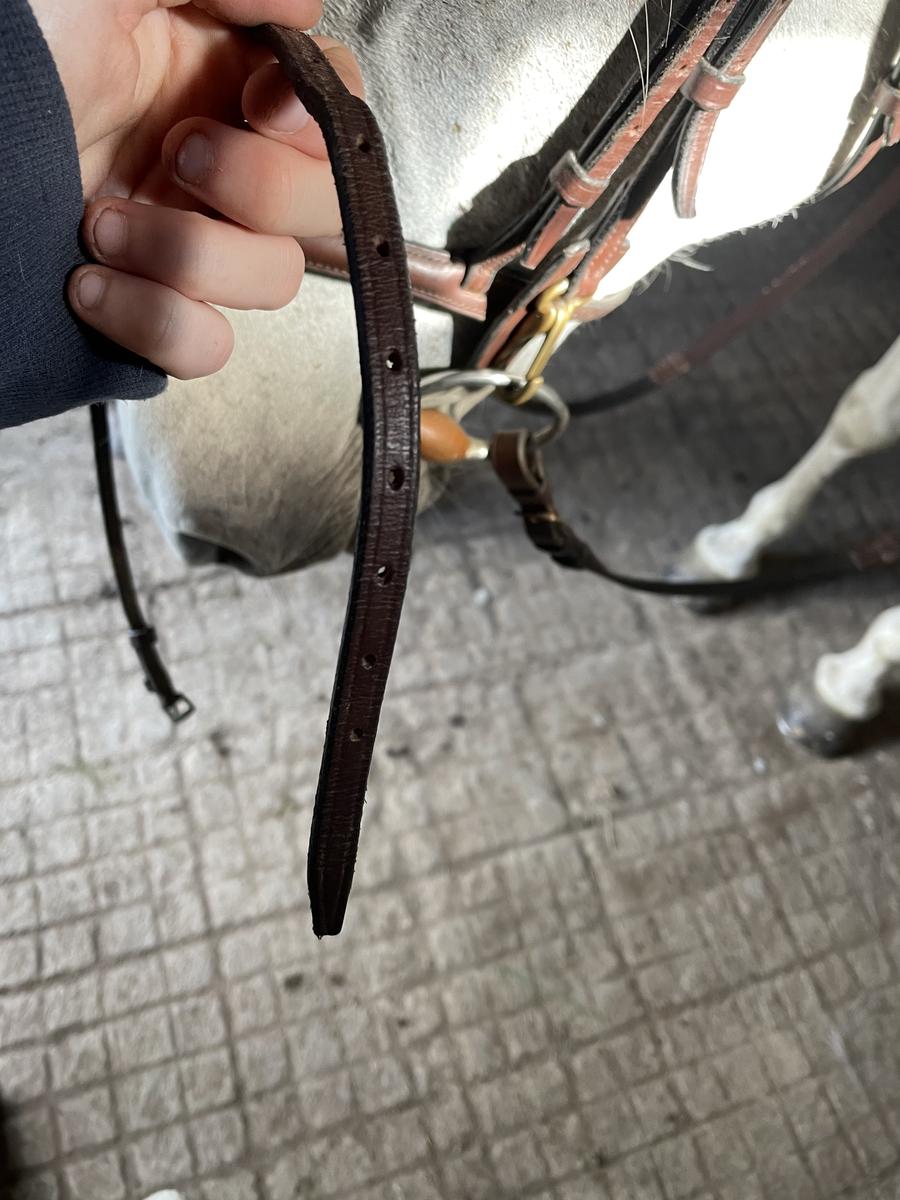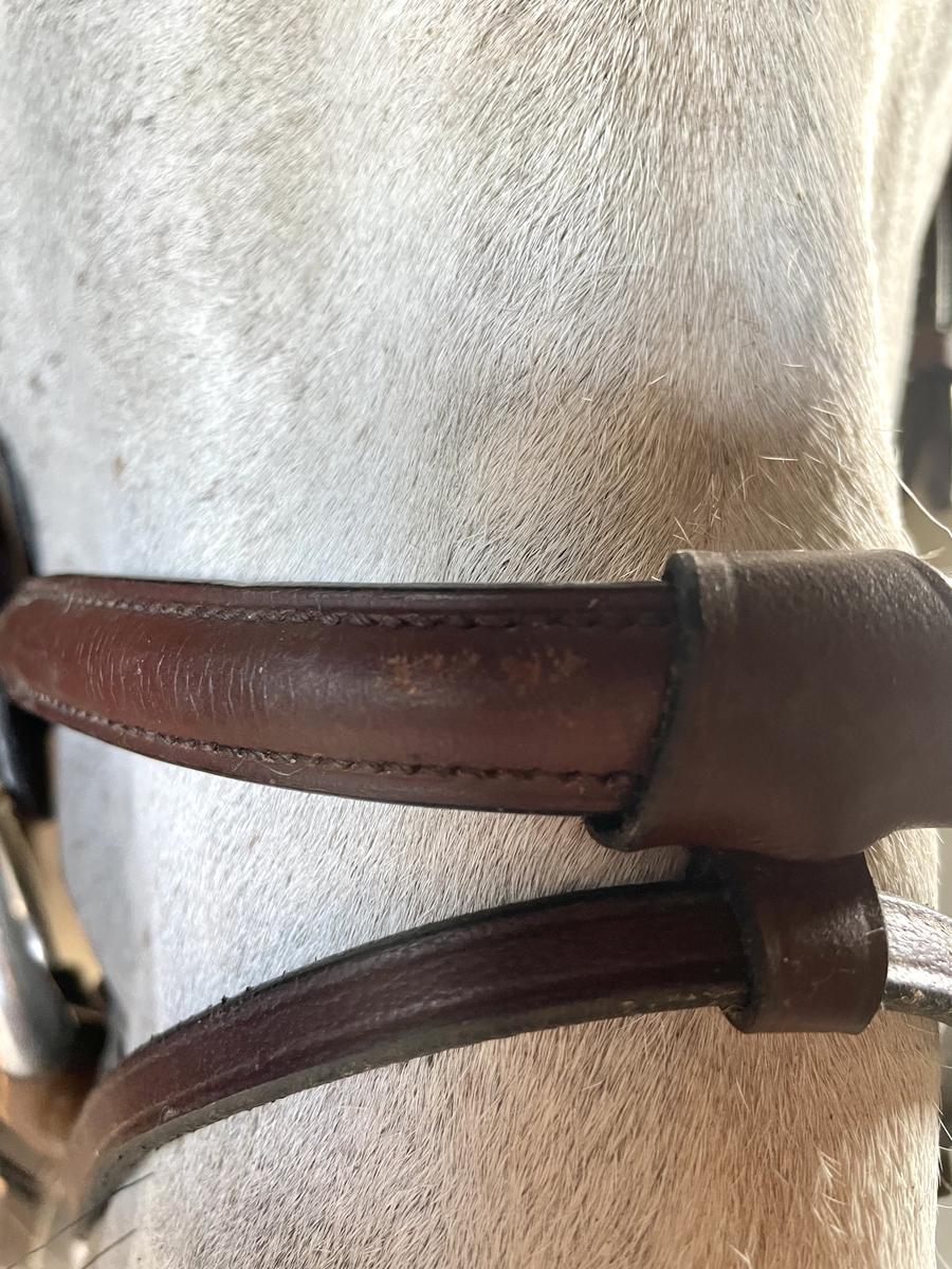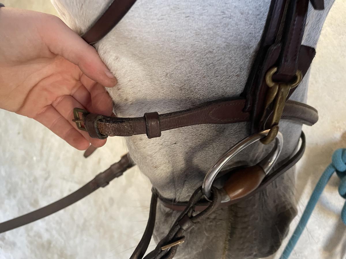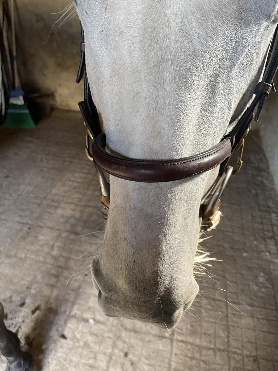 Vieux modèle de chez chetak (+ de 20/25ans) havane taille cheval peut convenir à un poney D (photo du gris) comme à un cheval de + d’1m75 ( photo du bai). Malgré une griffure sur la muserolle filet en très très bonne état, frontal droit, possibilité d’enlever le noseband grâce à la pièce de cuir. Têtière NON anatomique. VENDU SANS MORS ET SANS RÊNES. Prix négociable dans la limite du raisonnable.