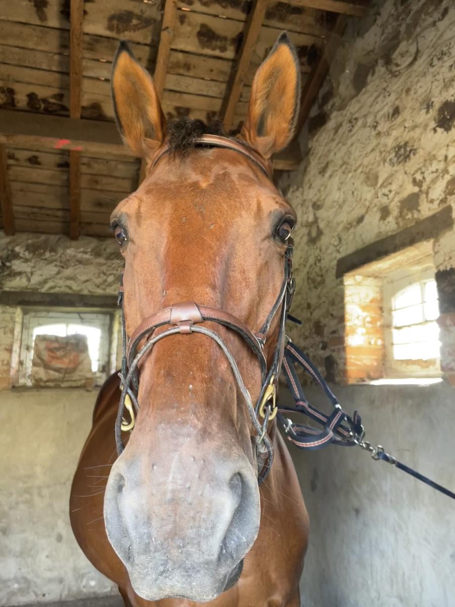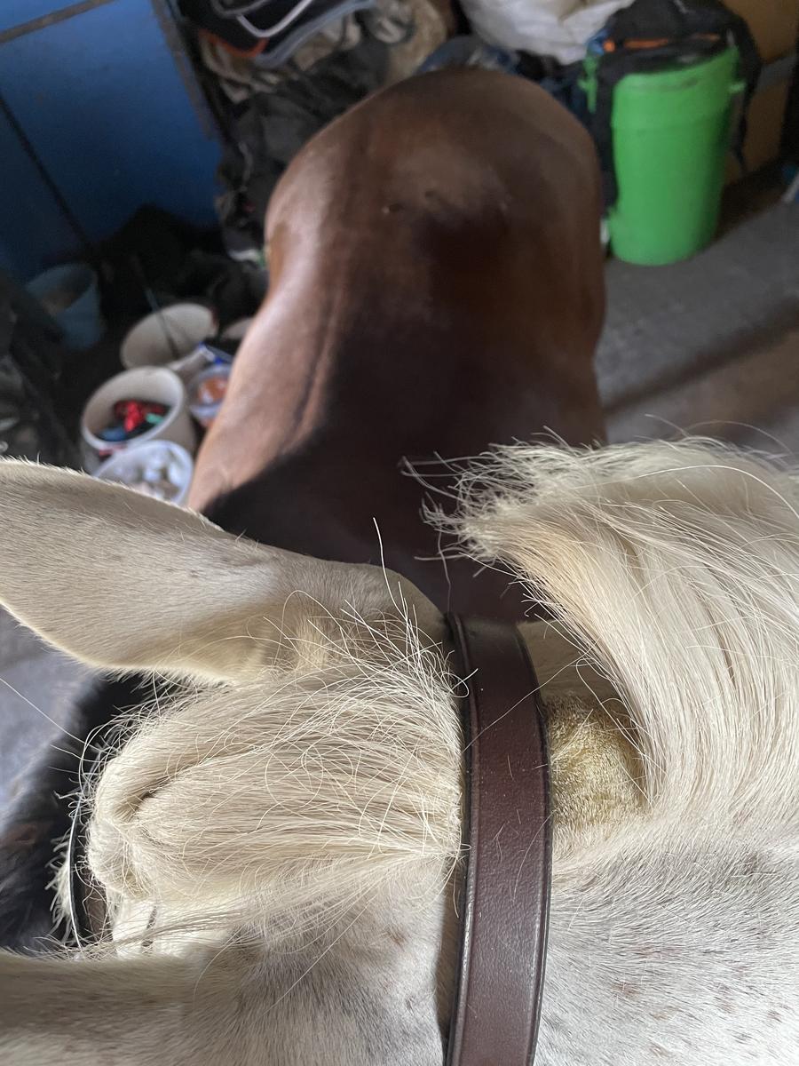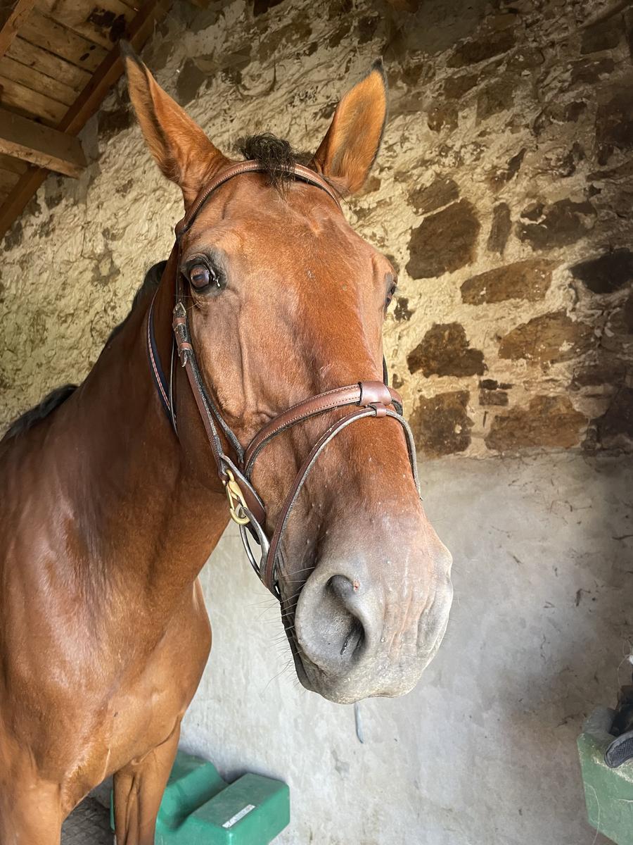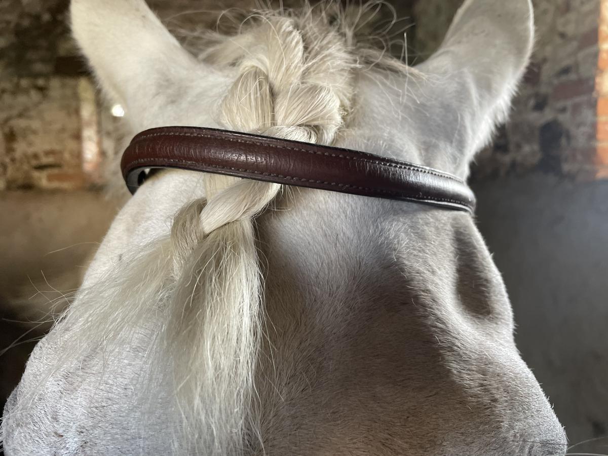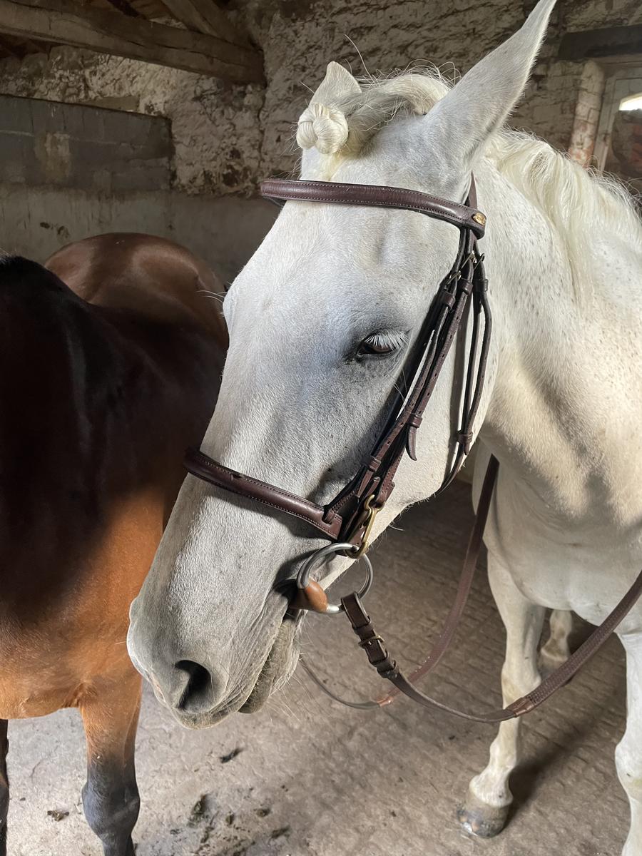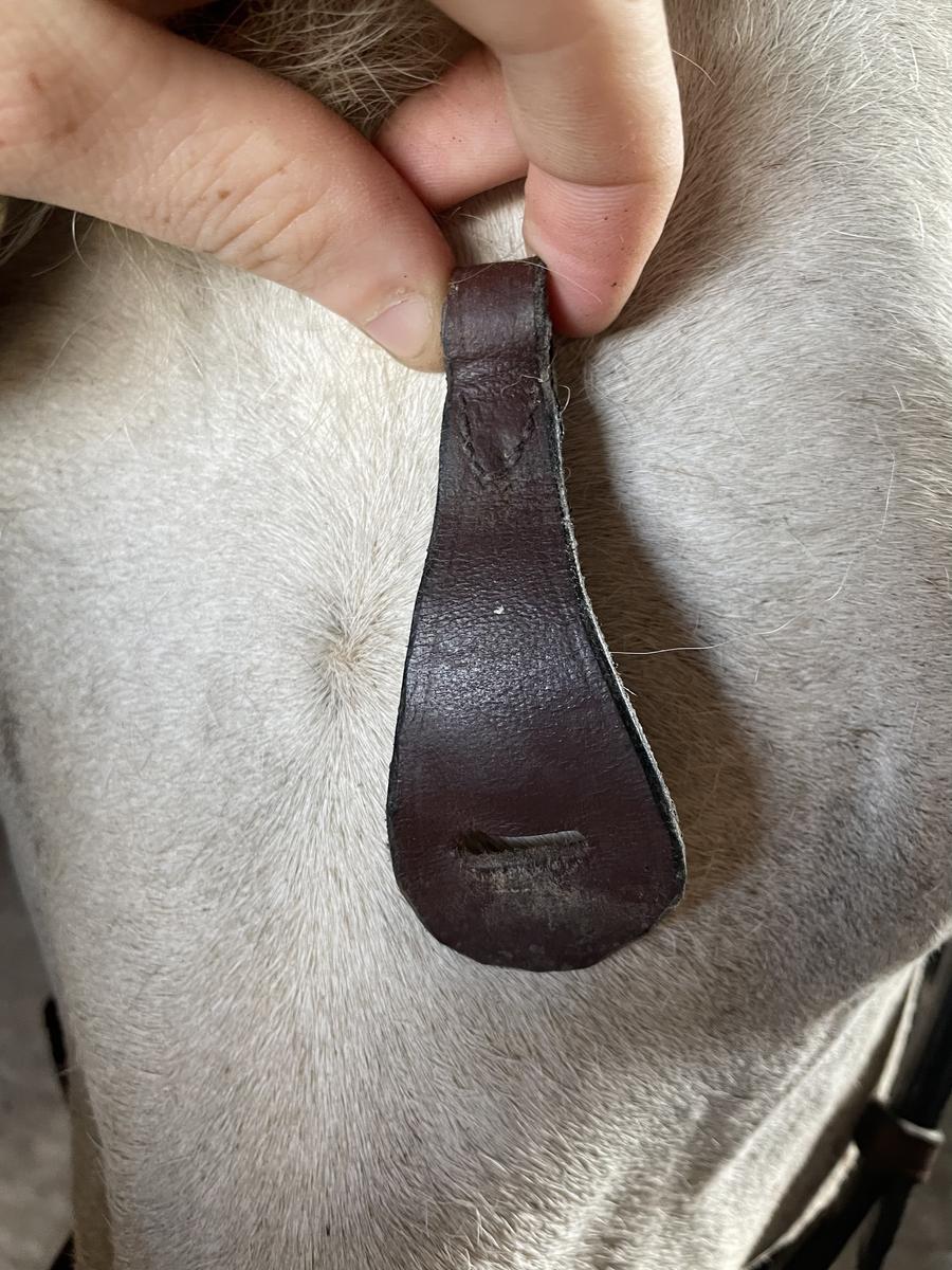 Vieux modèle de chez chetak (+ de 20/25ans) havane taille cheval peut convenir à un poney D (photo du gris) comme à un cheval de + d’1m75 ( photo du bai). Malgré une griffure sur la muserolle filet en très très bonne état, frontal droit, possibilité d’enlever le noseband grâce à la pièce de cuir. Têtière NON anatomique. VENDU SANS MORS ET SANS RÊNES. Prix négociable dans la limite du raisonnable.