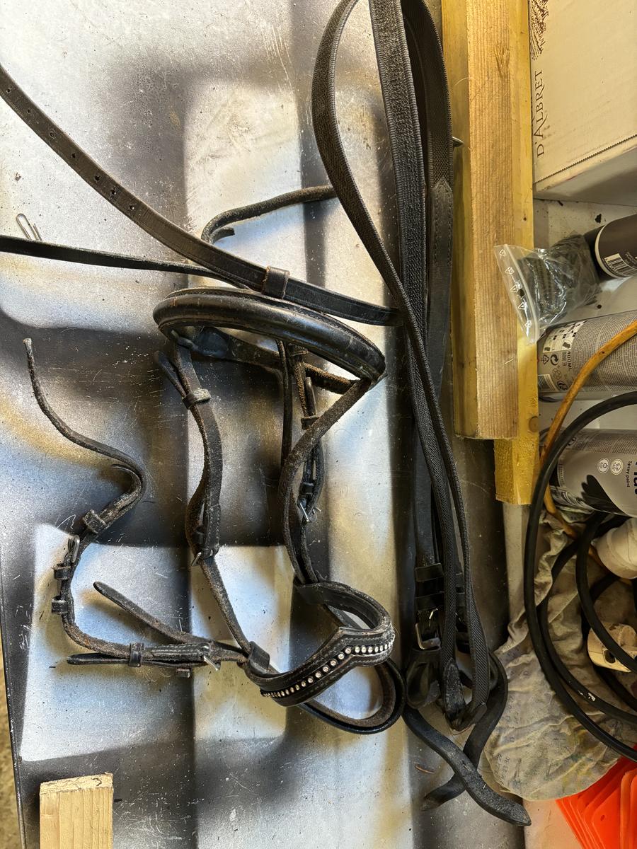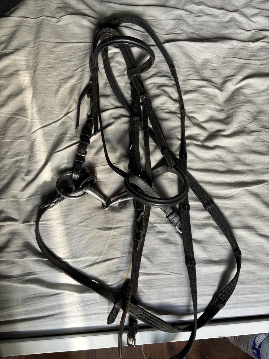 Lot de 2 bridons noir taille poney/shet avec un mors et une paire de rênes.