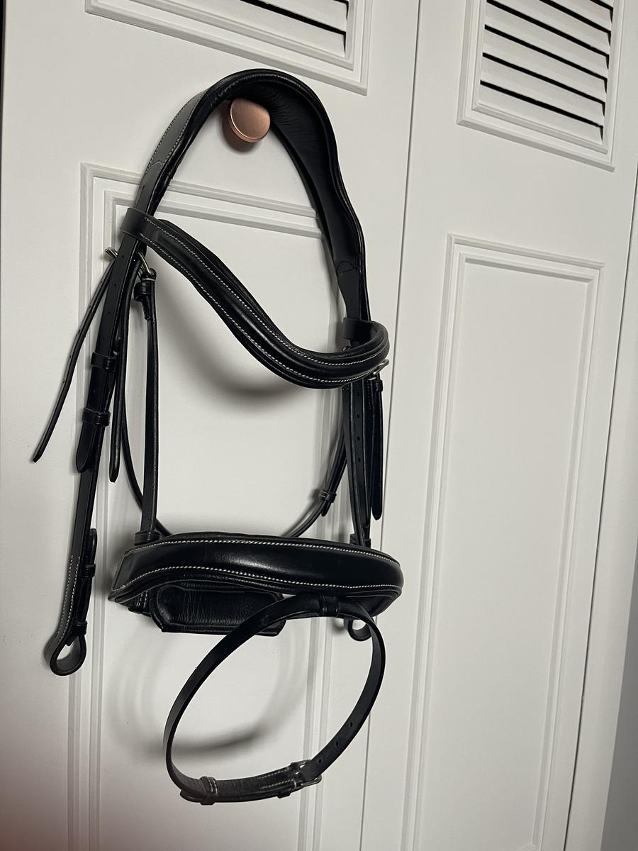 Description : Bridon en cuir de buffle, têtière anatomique large, frontal en"V" et muserolle combinée doublés cuir vachette matelassé avec coutures blanches
