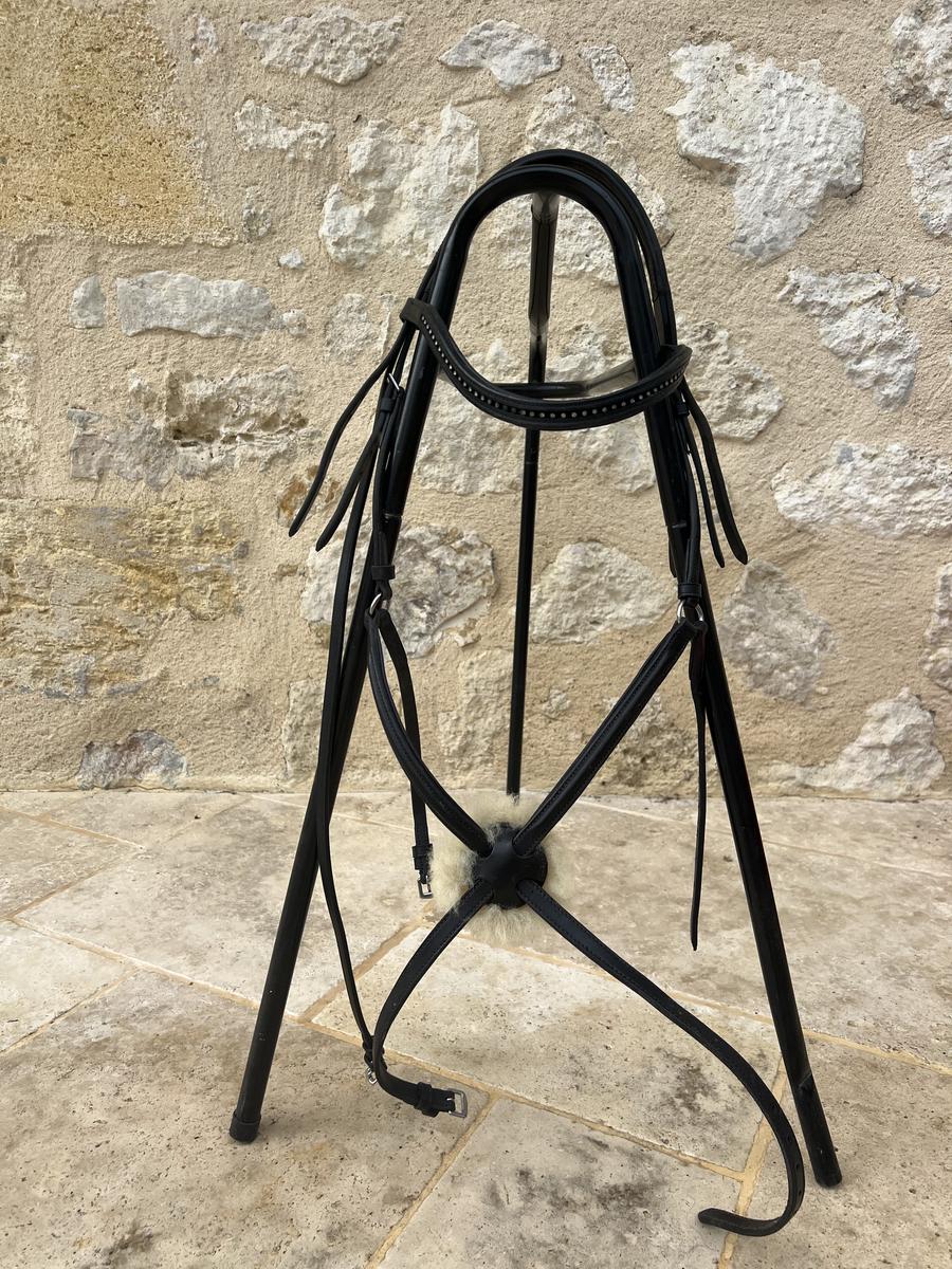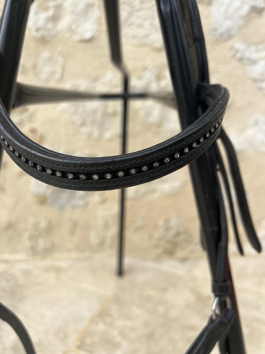 Vends bridon couleur noire. Frontal à strass argenté et muserolle croisée, cuir noir. Vendu avec rênes caoutchouc noires. Très peu porté, en très bon état. Merci