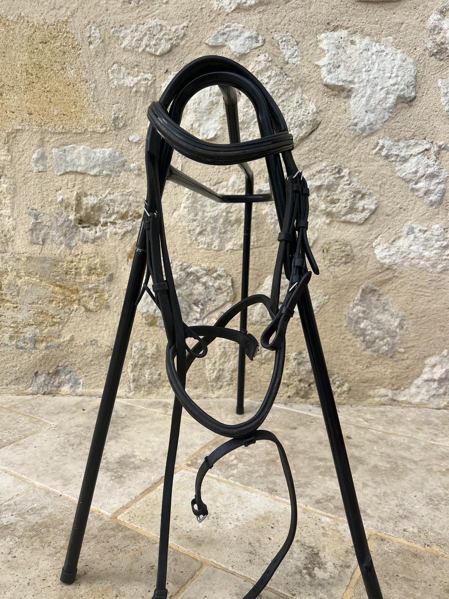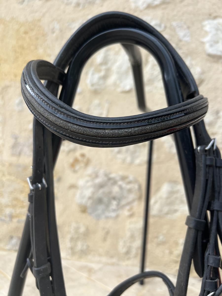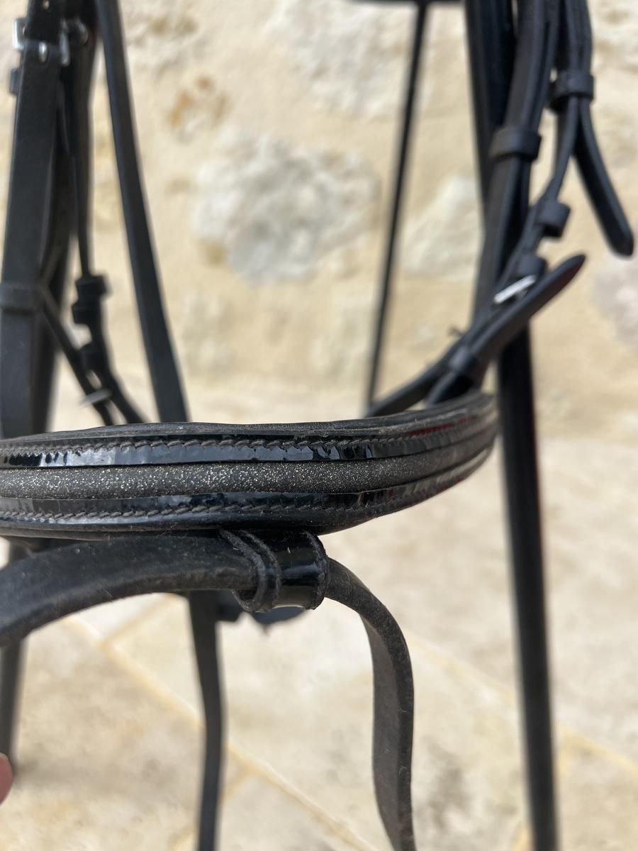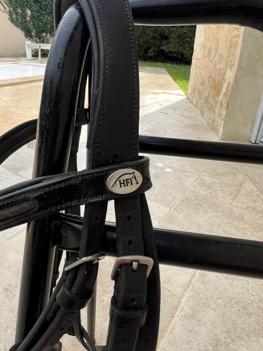 Vends bridon poney noir de la marque HFI. Frontal et muserolle combinée à strass argenté. Très peu porté, bon état. Merci
