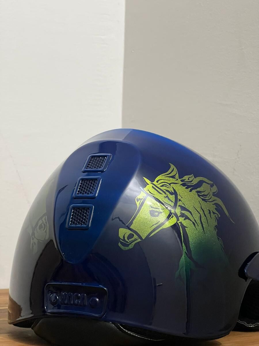 Je vends un casque NACA, modèle Gravity S carbone visière large amovible en édition ultra limitée (seulement 2 exemplaires) conçu pour le champion olympique français Karim Laghouag aux JO de Paris 2024. Le casque est recouvert d’une personnalisation signée DUC Design représentant la fontaine d’Apollon dans les jardins du château de Versailles en feuilles d’or, et est dédicacé par Karim Laghouag en personne (sous la visière).