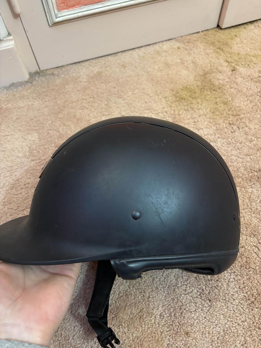 couleur bleu marine, aucune chute, présence de rayures, coque M vendue avec mousse taille 56