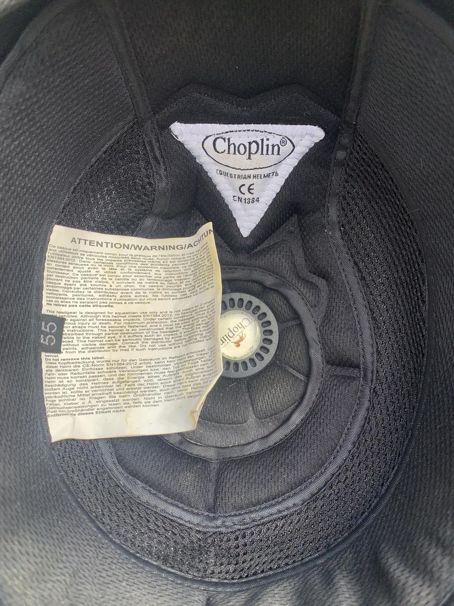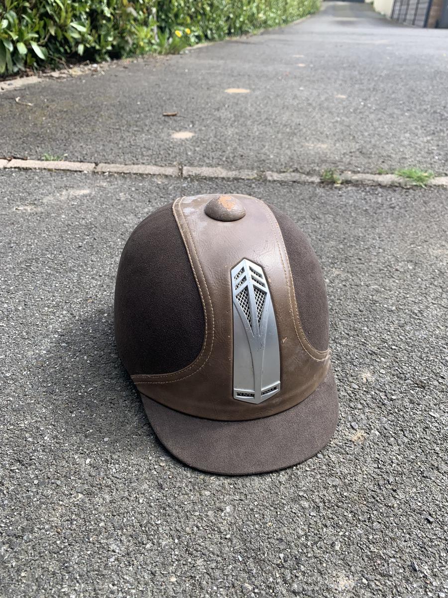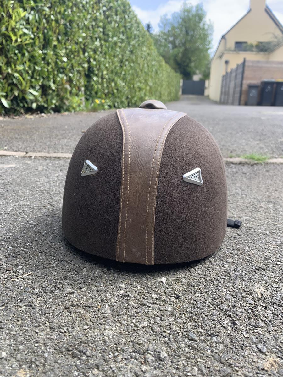 Bombe marron Choplin taille 55, légèrement abîmée sur le dessus.