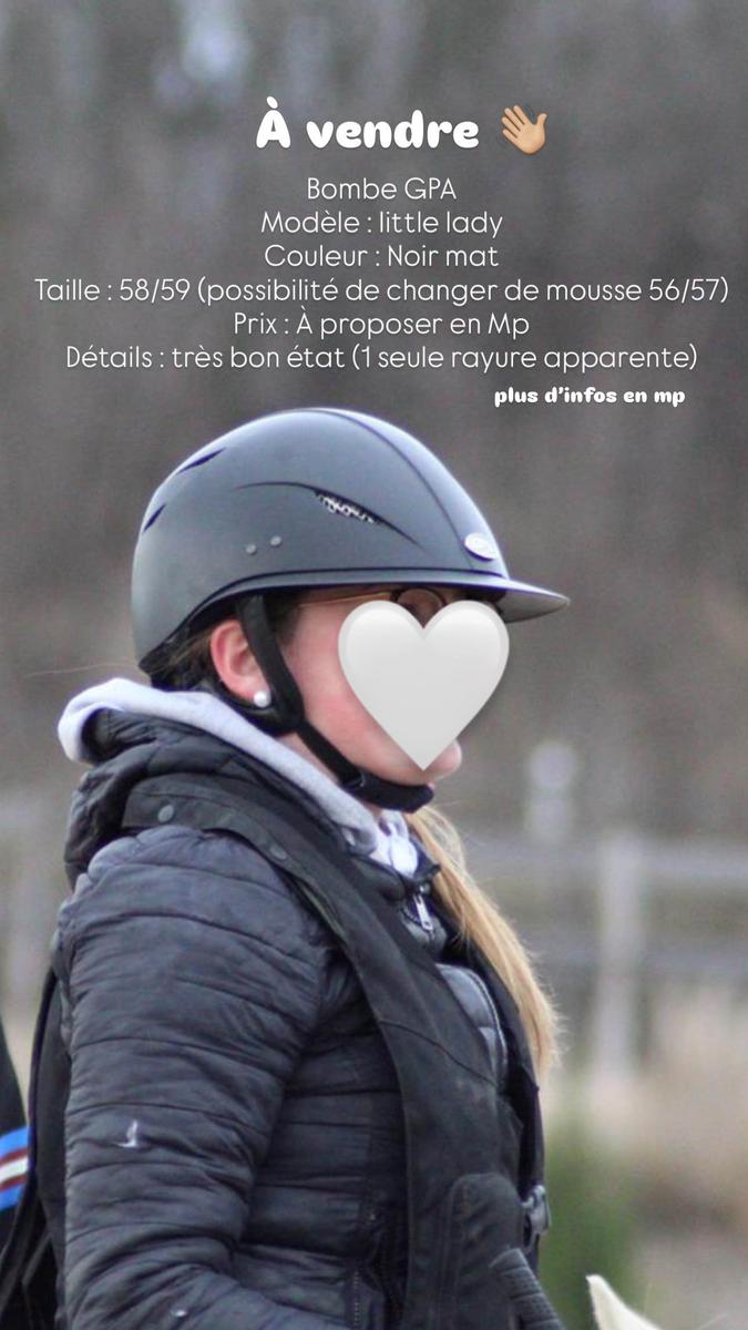 Bonjour, je met en vente ma Bombe gpa little lady, noir matte, mousse en 59 à l'intérieure possibilité de la passer en 57/58 en changeant de mousse (voir pour vous la procurez sur internet) Payé 299€, elle est en très bon état une rayure légèrement apparente sur l'arrière du casque. Sac de protection fourni avec. Prix à voir en Mp (le prix sur l'annonce est un prix ne correspondant pas)