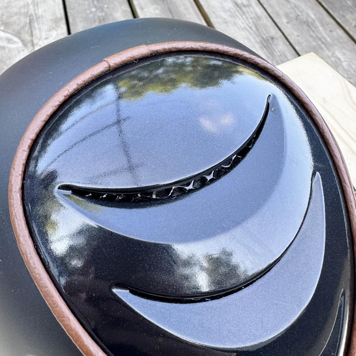 Neuve, jamais mise, propre et lavée Raison de la vente : cadeau Taille 55 (56 GPA) Visière large, bordure et sangle en cuir véritable marron Grillés de ventilation en inox Sets de mousses intérieures amovibles, respirantes et lavables Vendue avec sa housse