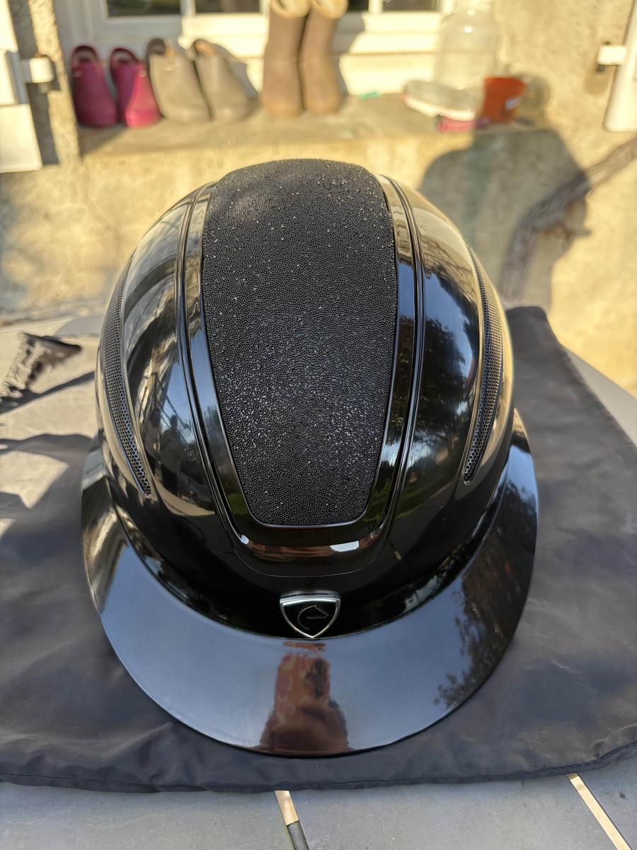 Jamais porté sous la pluie, uniquement par temps sec ou en manège. Nettoyé après chaque utilisation et toujours stocké dans son pochon.