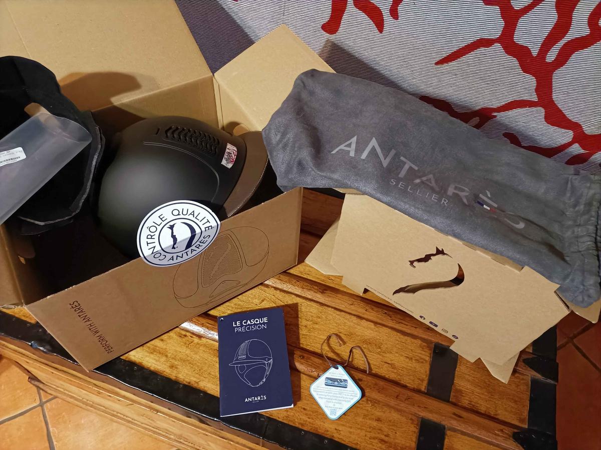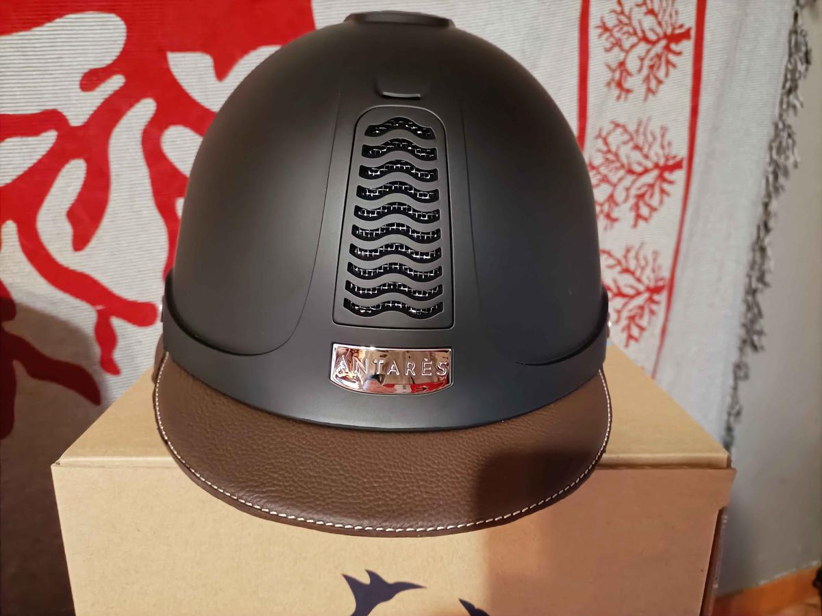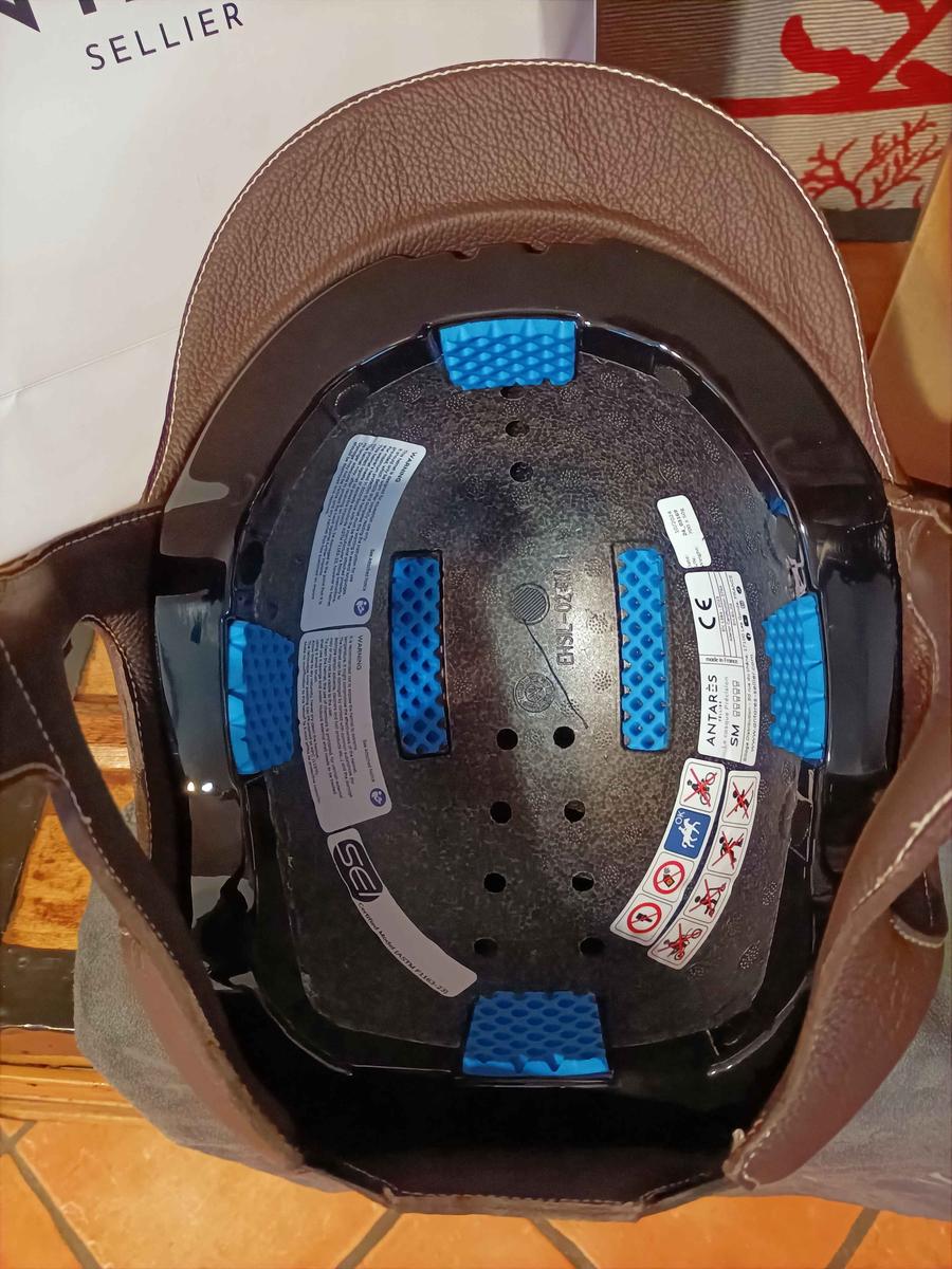 - Casque Antares Nouvelle Gamme Précision Galaxy Chrome - Casque noir, visière et harnais cuir marron, accessoires chromés - Vendu neuf 350 euros au lieu de 400 euros avec pochette grise Antarès, carton contrôle qualité avec cale intérieure - Taille adaptable avec achat de l'intérieur (Mousse) à adapter à votre taille (18 euros). Actuellement vendu avec intérieur taille 57 plus cale arrière - Système de fixation avec boucle aimantée "Fidlock", permettant d'attacher le casque à une main - Élastiques noirs présents à l'arrière du casque sur le harnais, permettant une décompression à l'arrière de la tête - La norme européenne impose le fléchissement de la visière lorsqu’une charge est appliquée sur celle-ci. Cela évite qu’elle ne se casse et blesse le cavalier. La visière des casques Antarès est donc volontairement souple. En cas de déformation, elle peut être manipulée manuellement afin de lui redonner sa forme originale. - Plus de détails encore sur ce casque Antarès sur demande ou sur site