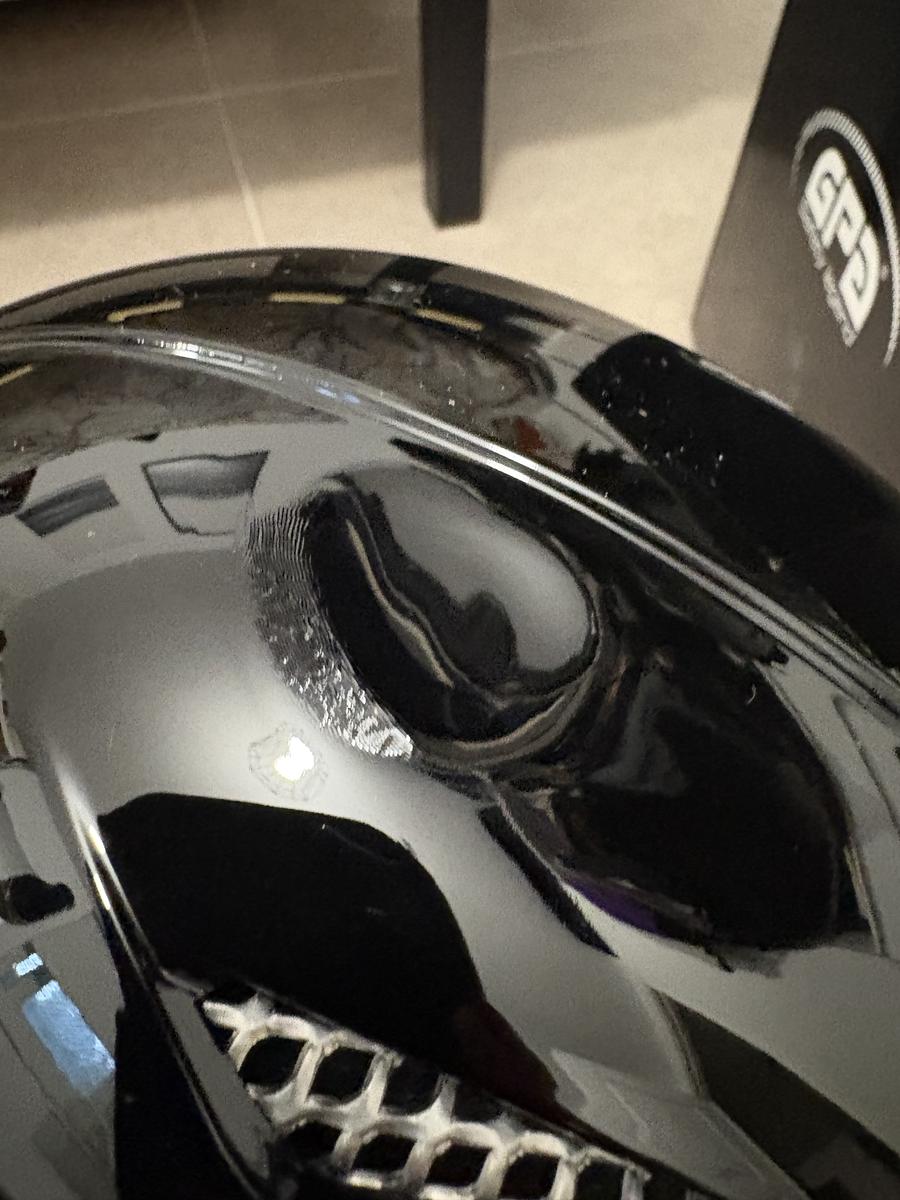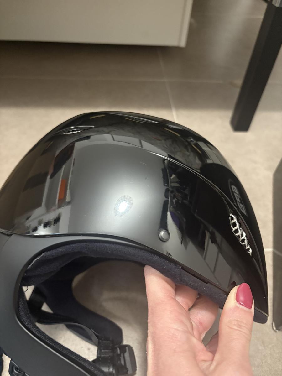 Aussi, il a un accroc sur un des côtés (photo) ; pas du à une chute (car le casque est neuf, jamais porté). Mais il a été trop proche d’une exposition lumineuse (ça a légèrement fondu).