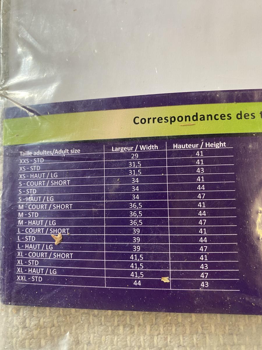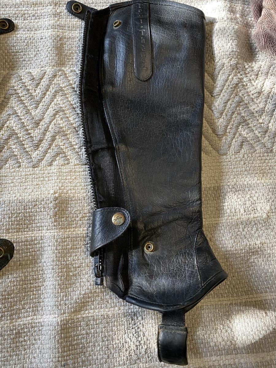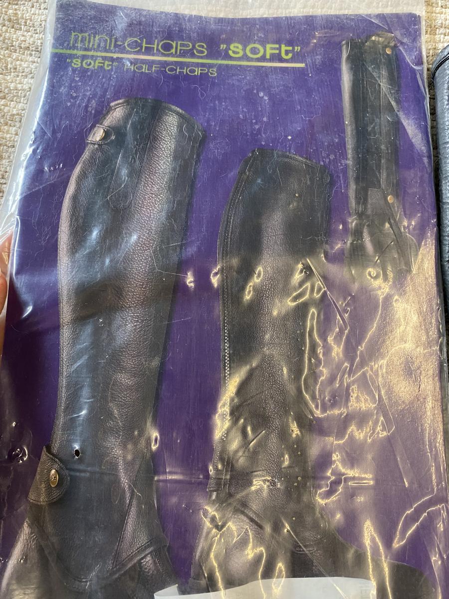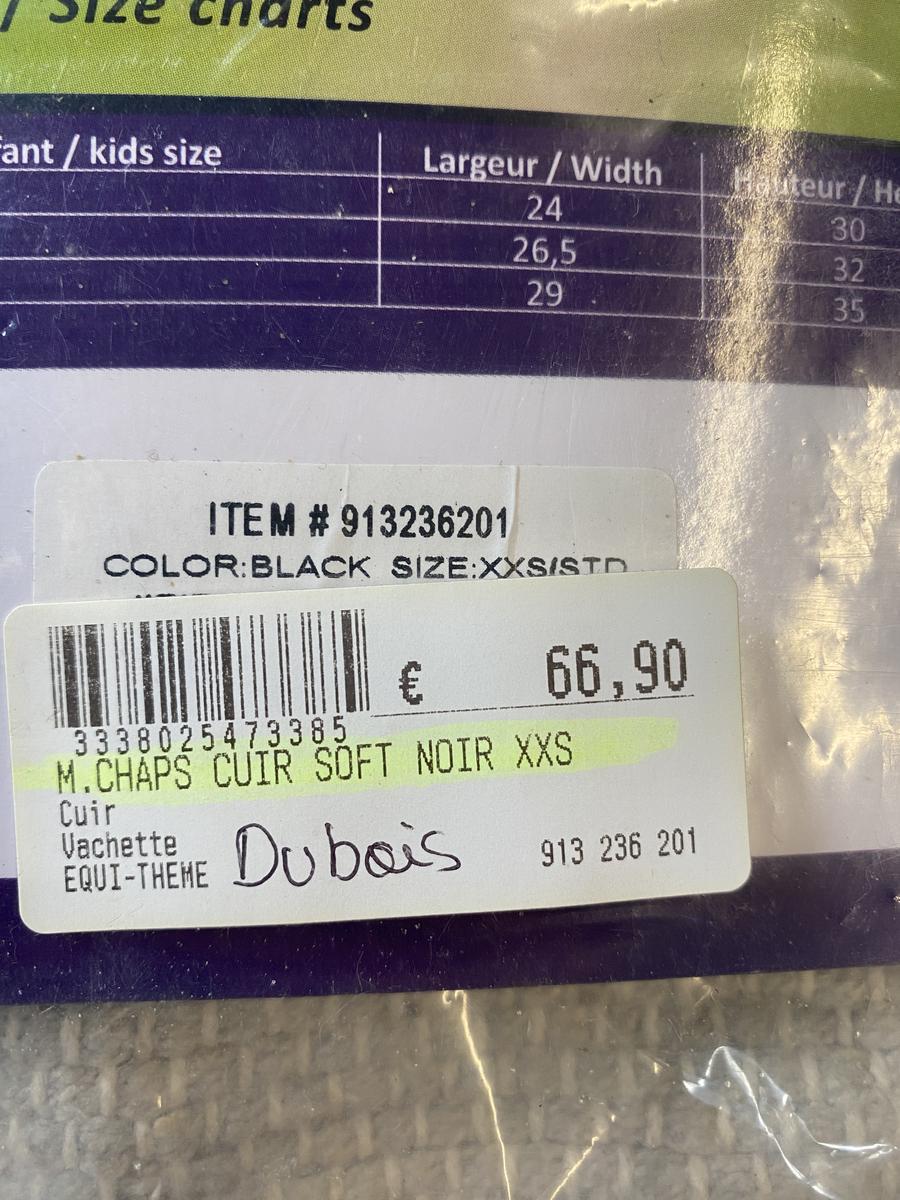 Mini chaps en cuir noir de la marque equitheme, taille XXS STD (se référer au tableau des tailles sur l’emballage joint), convient aussi à un XS STD qui est la taille que je porte désormais.