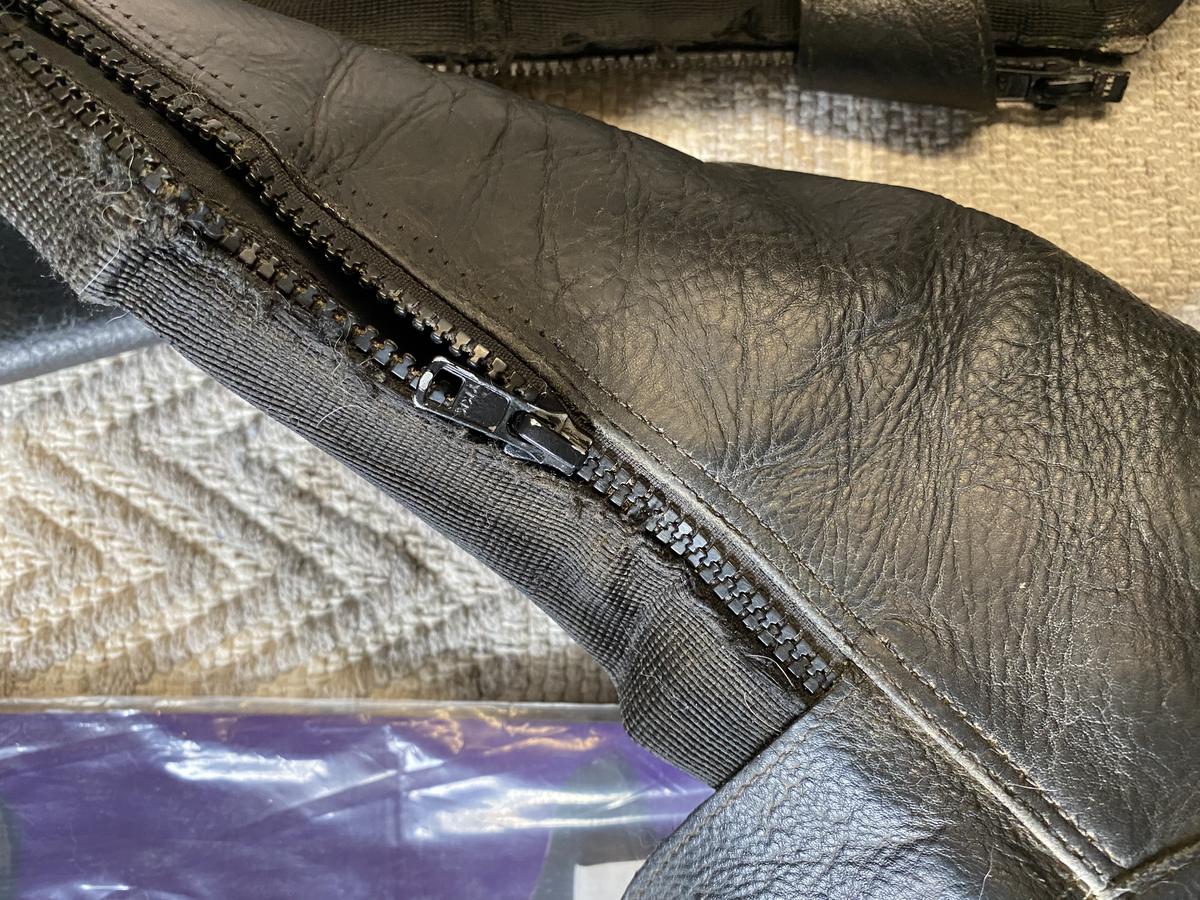 Cuir en très bon état, une fermeture éclair est à réparer ou changer, l’autre est niquel.