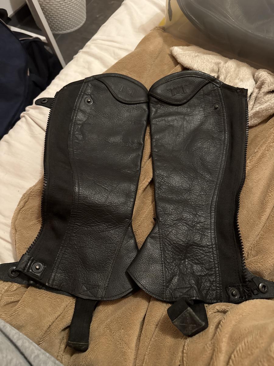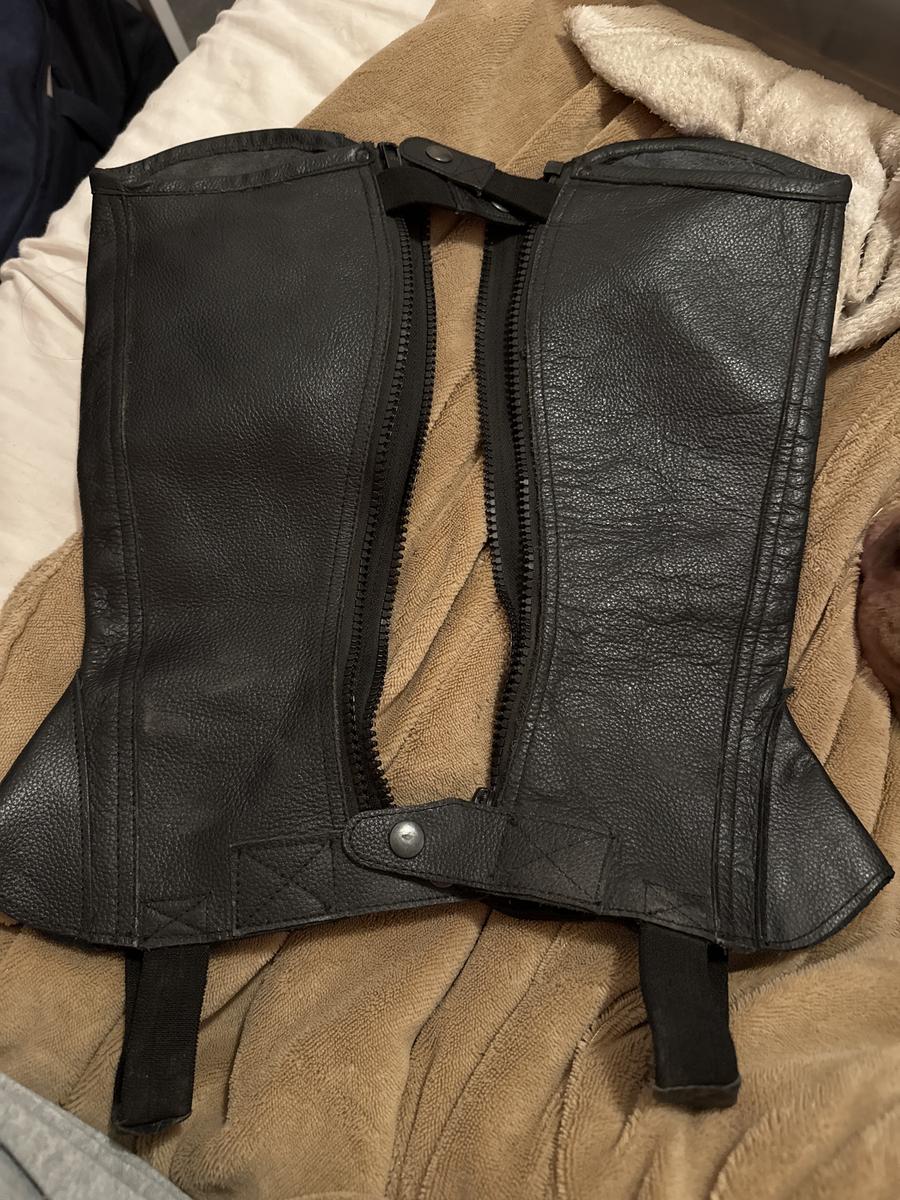 Chaps tdt noir en cuir taille petit L je fait du M et elle me vont pas donc convient plus à du s et neuf juste mise une fois pour essayer