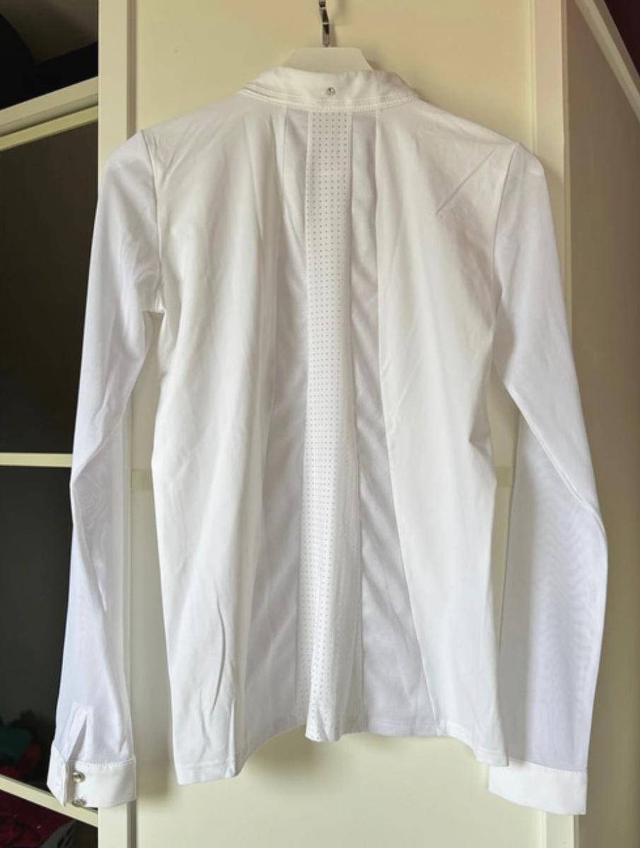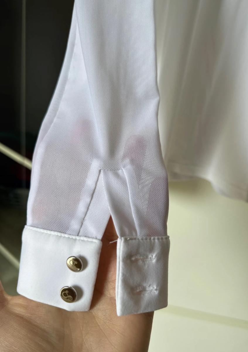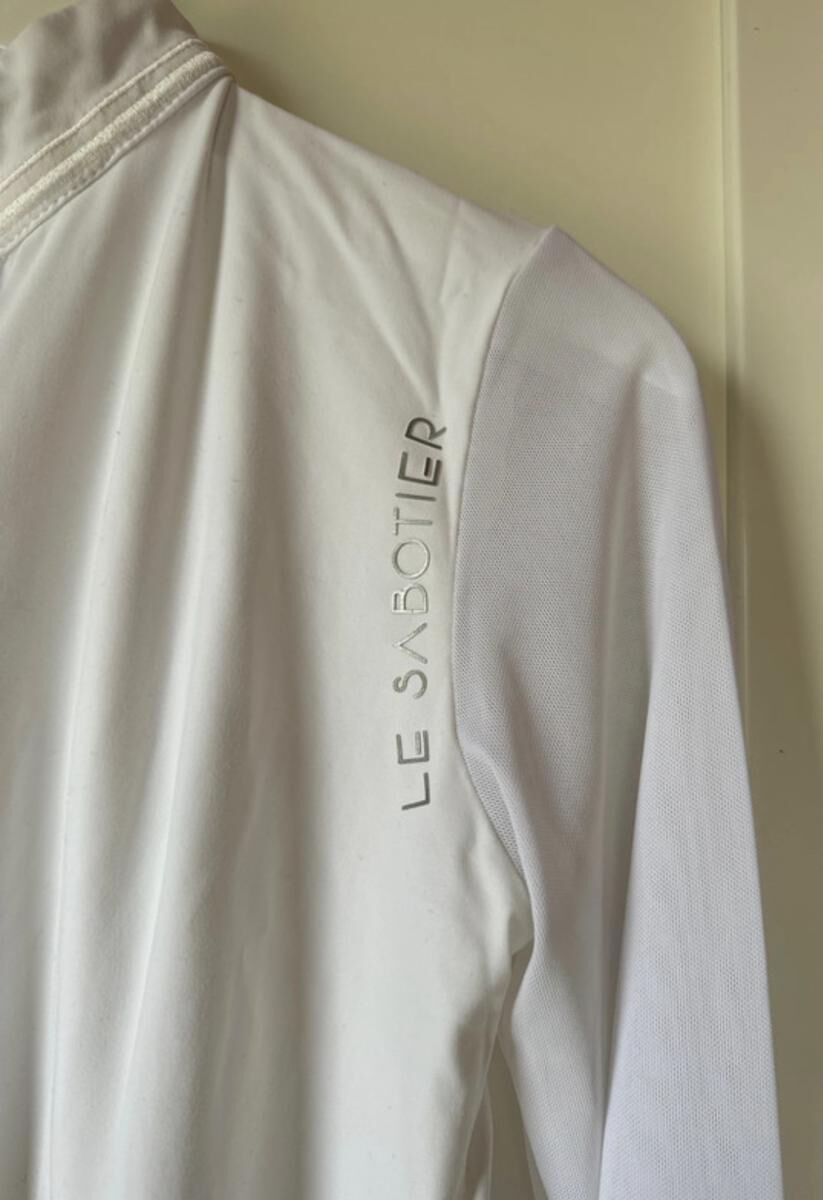 Polo de concours blanc le sabotier taille 40, neuf jamais porté, manches longues matière transparente comme un voile, coupe cintrée