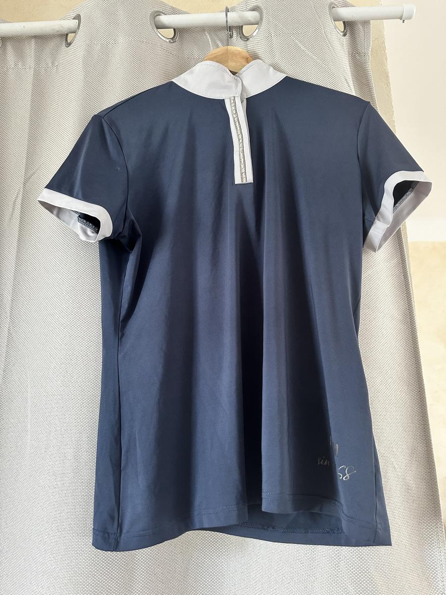 Polo de concours bleu marine HKM porté une saison de concours. Boutonnière avec strass (toute présente).