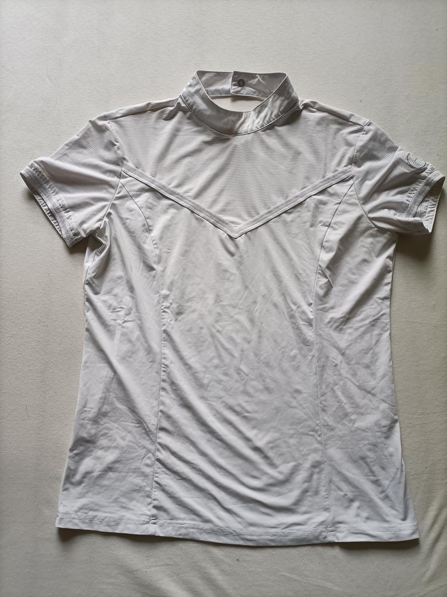 Polo de concours Harcour blanc. Coupe cintrée, matière légère et respirante. Fermeture à l'arrière du polo avec un bouton à pression. Logo Harcour brodé sur le côté de la manche gauche. Porté 1 fois.