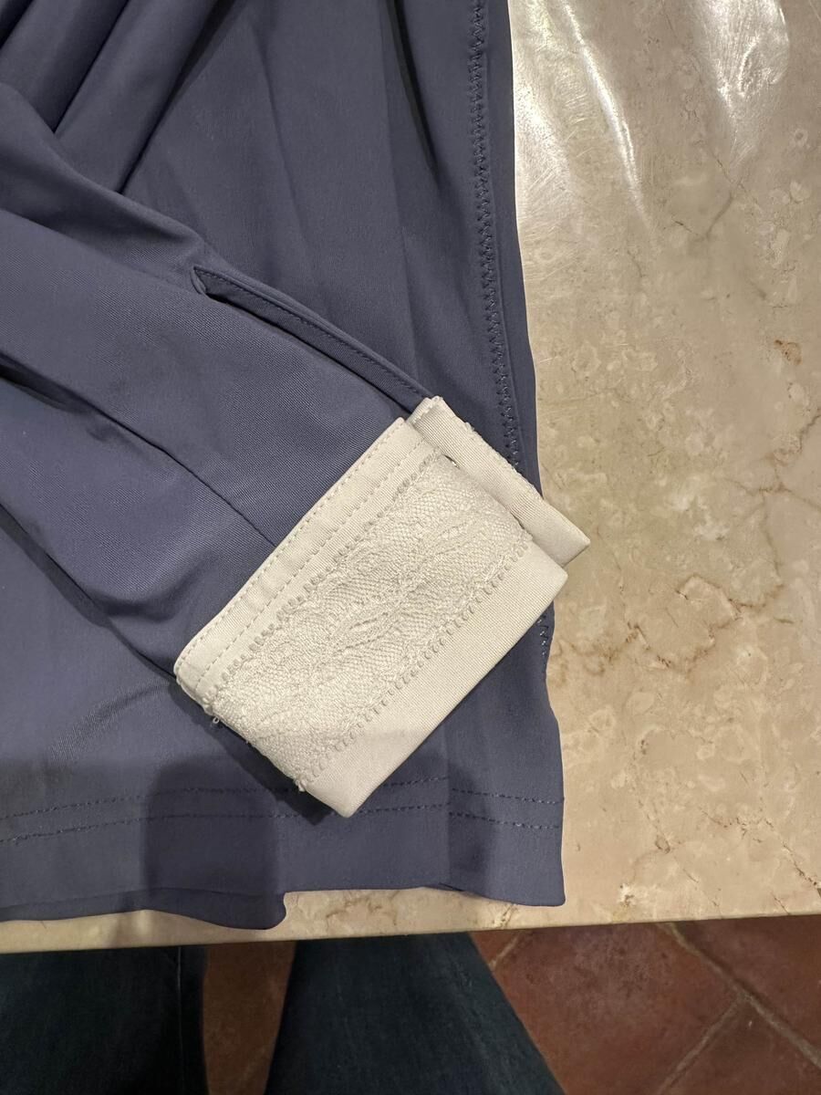 polo Samshield manches longues, bleu (bleu/gris) avec détails de dentelles sur le col et les manches.