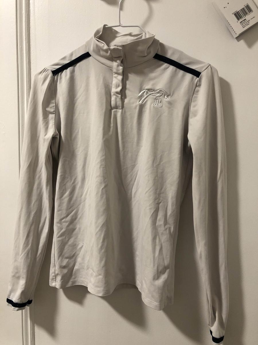 polo de concours manches longues Pénélope blanc, liseré bleu marine pailleté le col se ferme par 3 pressions porté une saison taille s