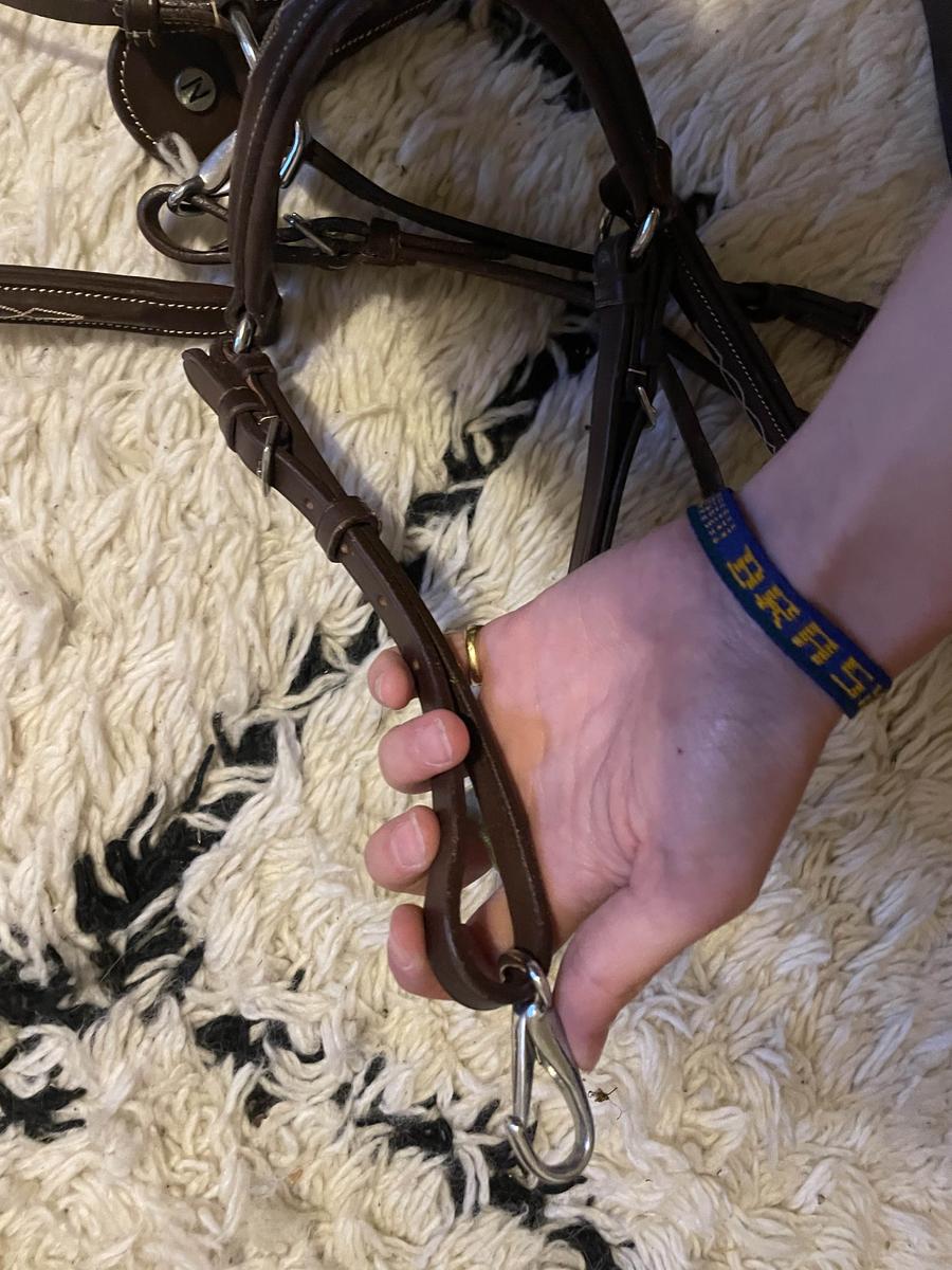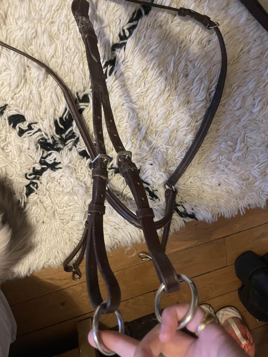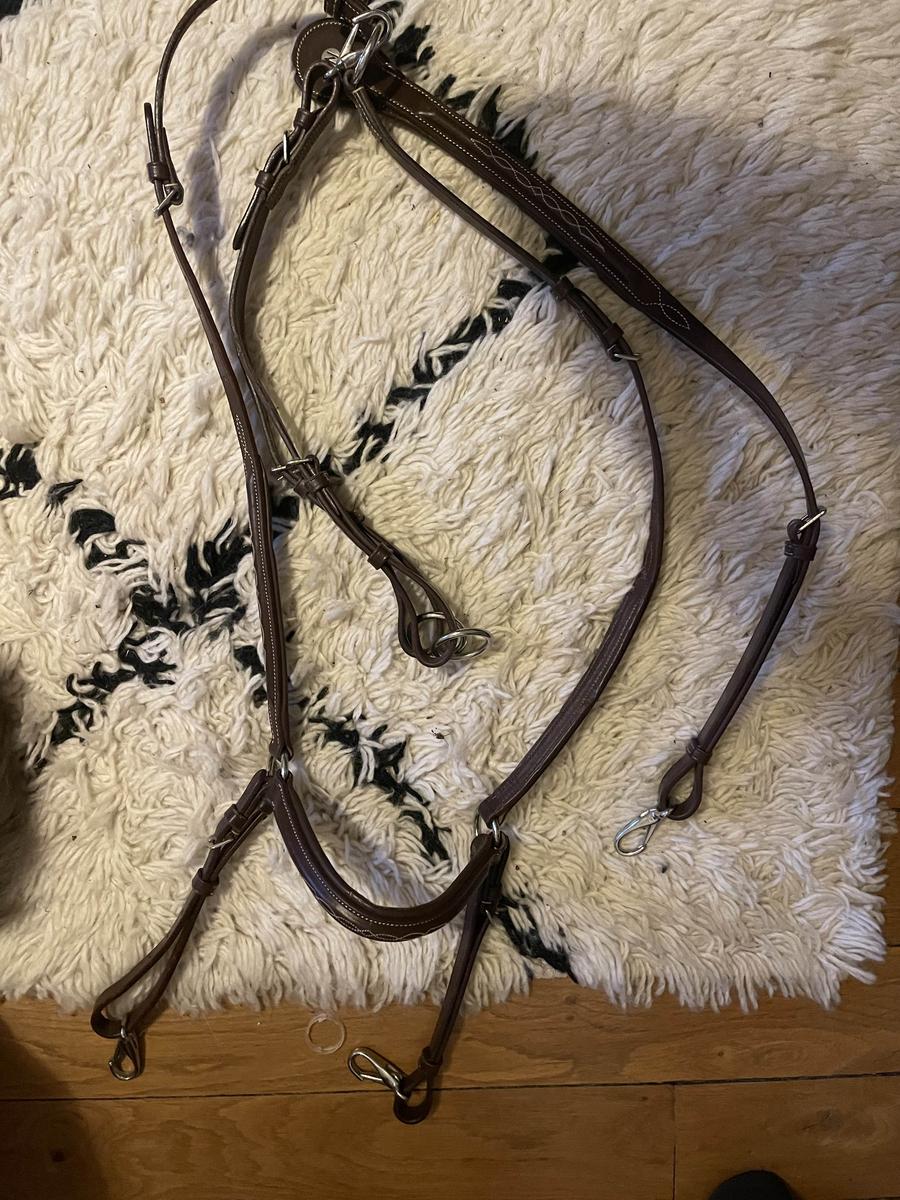 Collier de chasse avec martingale marron. En très bon état, porté quelques fois. Taille poney C/D.