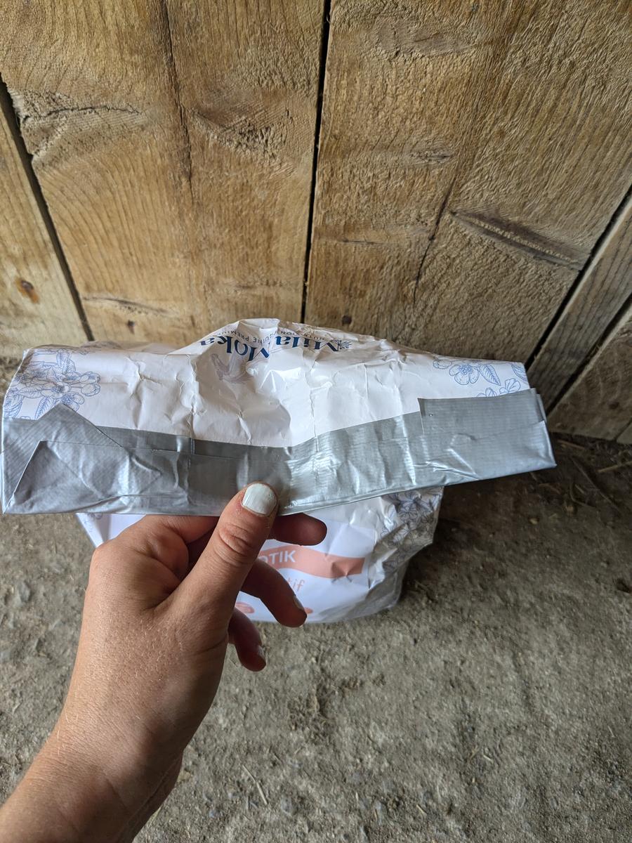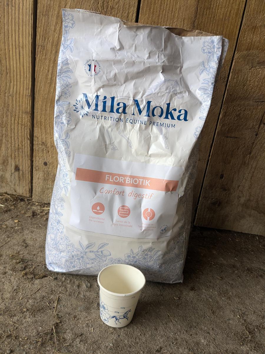 Le sac a été ouvert 1 semaine, a raison de 35gr par jour donc j'ai consommé 245gr uniquement. Mais mon cheval ne le mange pas. La DLUO est de 1 an si il reste à l’abri de l'humidité, voir photo 06/2025. C'est pour cela que je l'ai fermé proprement avec du scotch et il est actuellement conservé dans ma maison.