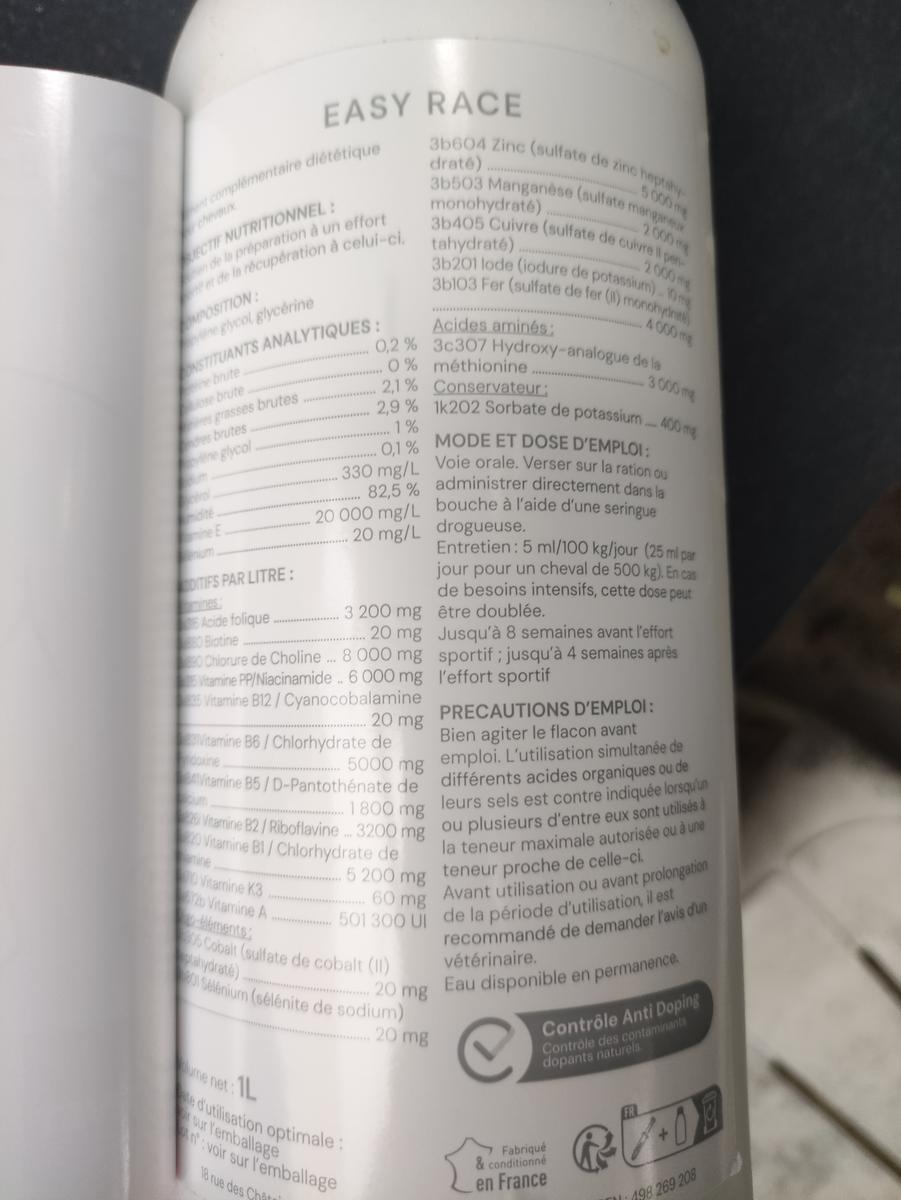 Easyrace est un booster pour cheval sous forme liquide à administrer juste avant une compétition ou une course. Ce complément alimentaire offre un apport complet en vitamines et oligo-éléments aux chevaux.