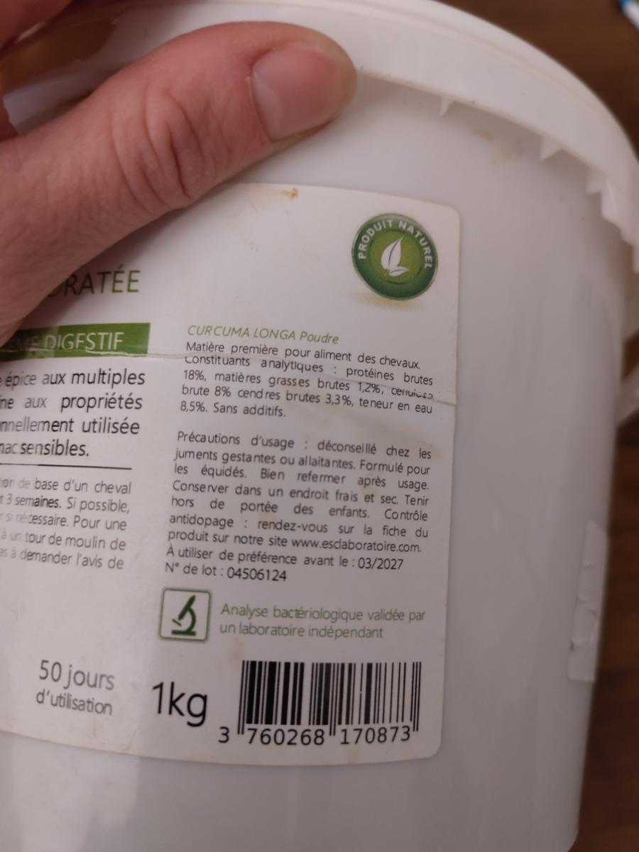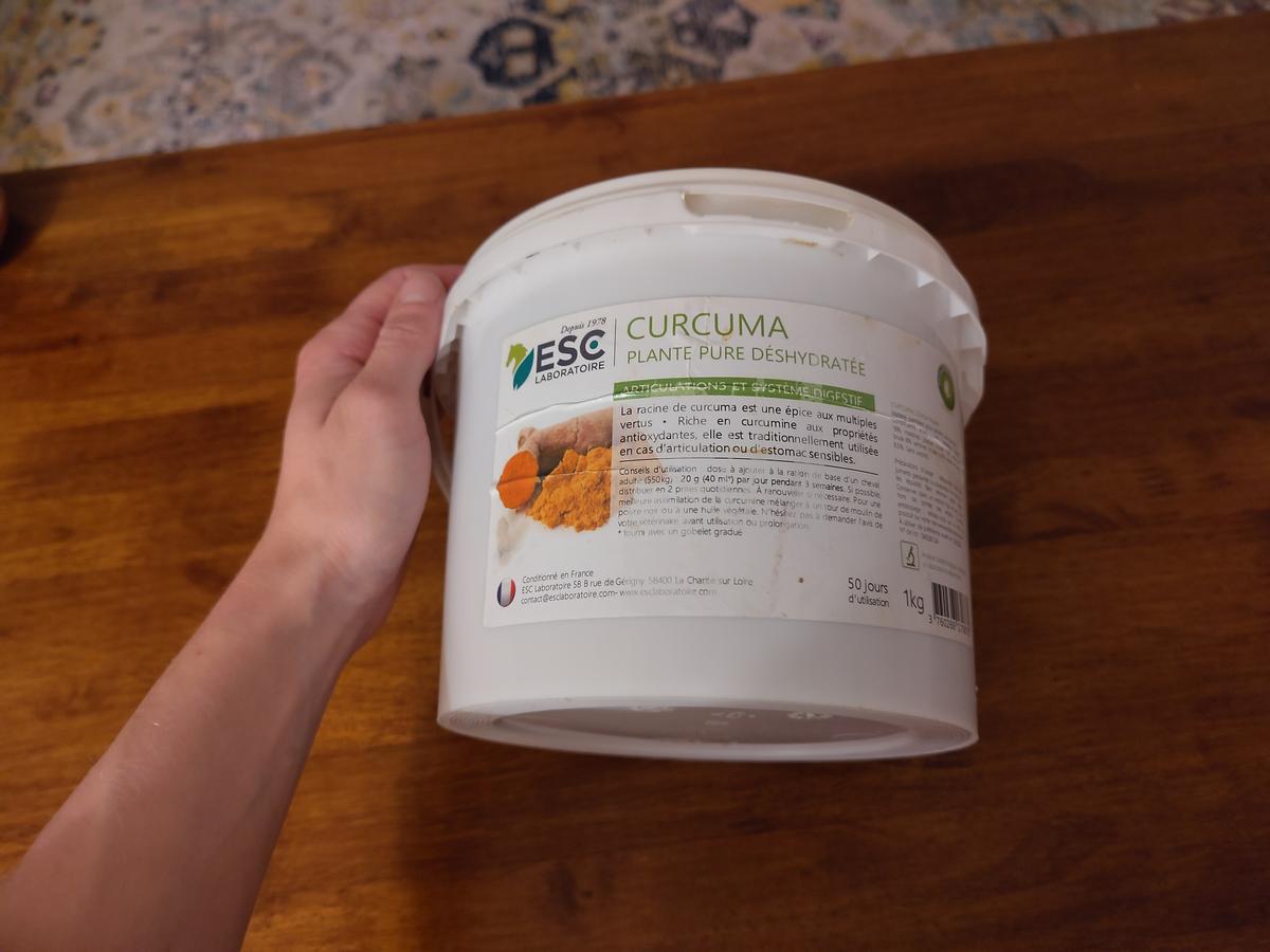Je vends un pot de curcuma en poudre, complément alimentaire du cheval. C'est un anti inflammatoire réputé bénéfique entre autre au niveau de l'estomac et des articulations.