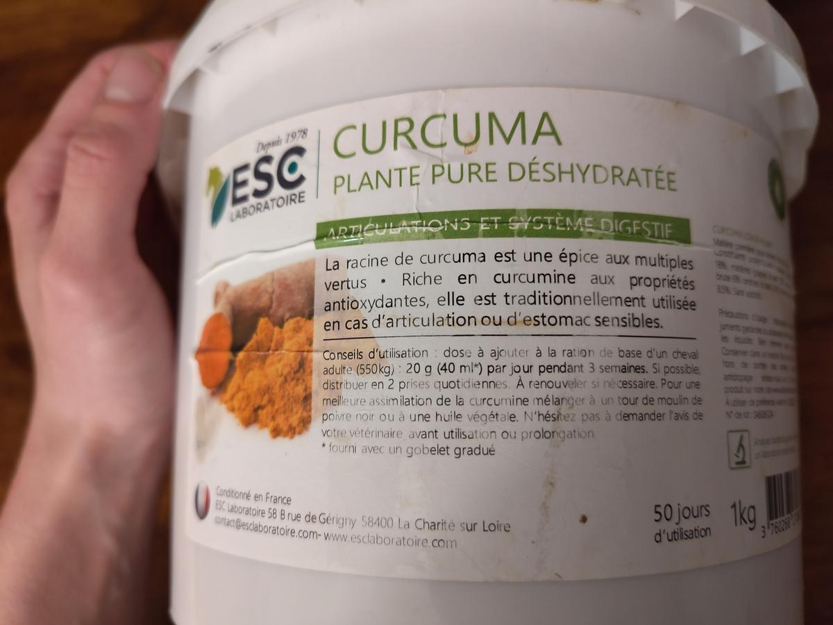 Je vends un pot de curcuma en poudre, complément alimentaire du cheval. C'est un anti inflammatoire réputé bénéfique entre autre au niveau de l'estomac et des articulations.