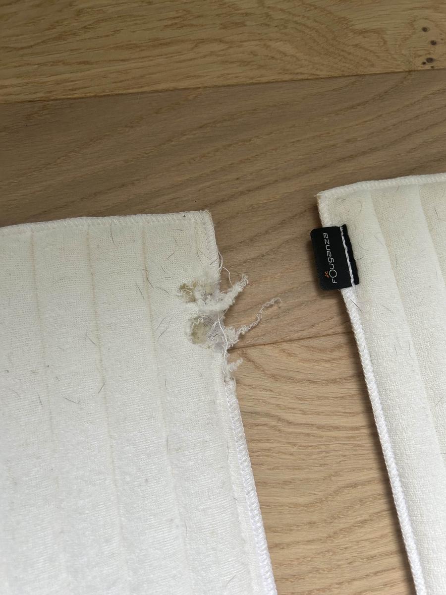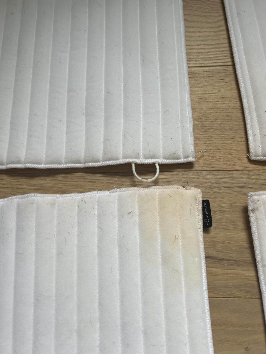 lavée mais il reste des poils et des taches, l’une d’entre elle est abîmé sur le côté ( visible sur les photos)