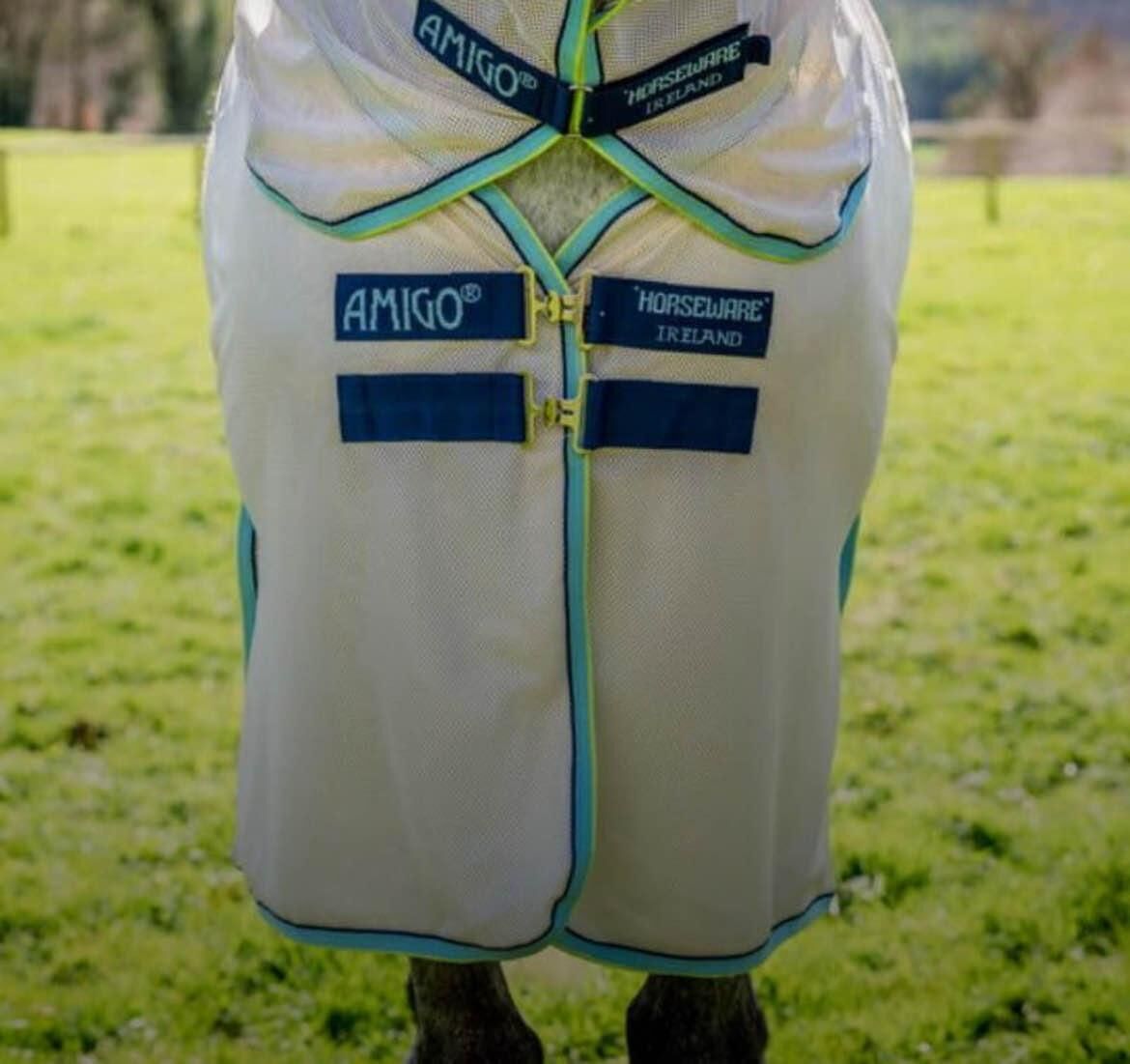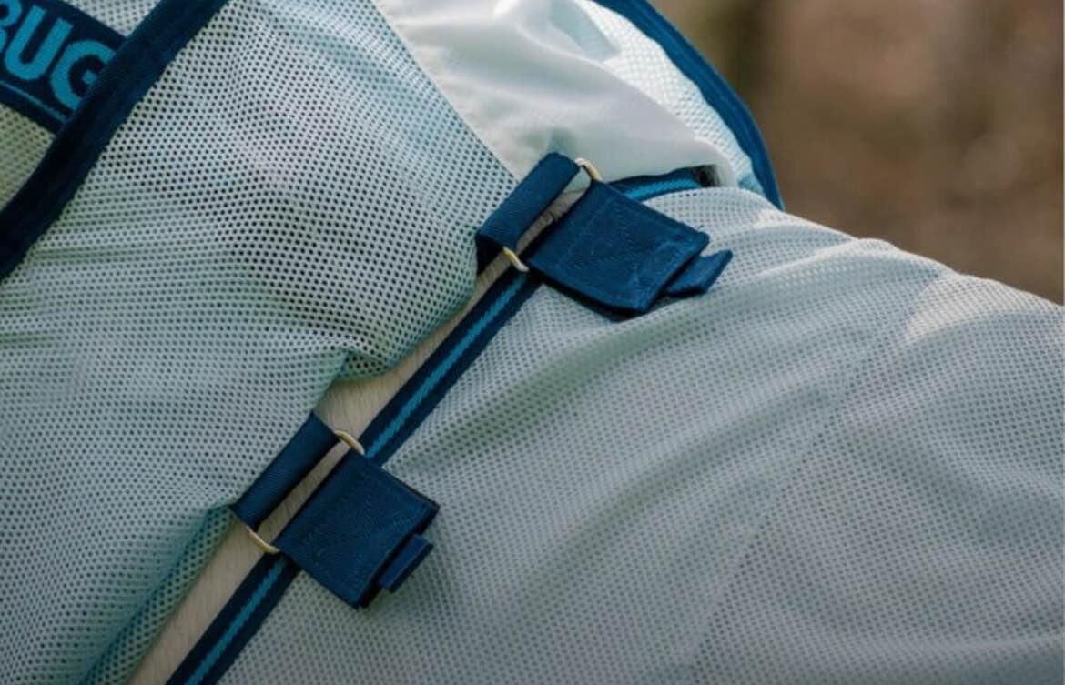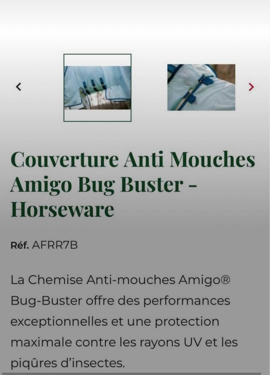 Couverture mise environ 10x car après arrivée de la pluie, totalement neuve, couvre cou intégré Protège un maximum des insectes au ventre, à la queue, sur les pâtes Possible de prendre le masque à mouche avec pour 10€ de plus Fonctionne très bien pour les chevaux qui ont de la dermite Elle est « auto réparatrice » si jamais il y a un accrochage, grâce aux mailles très fines