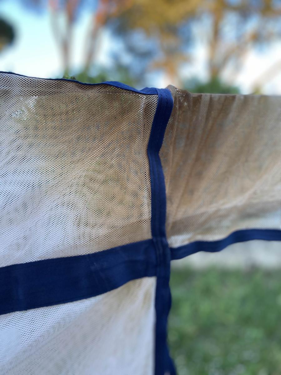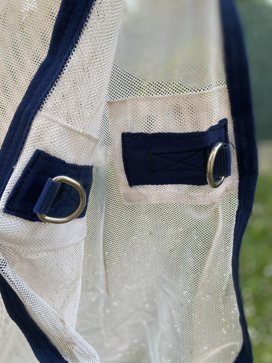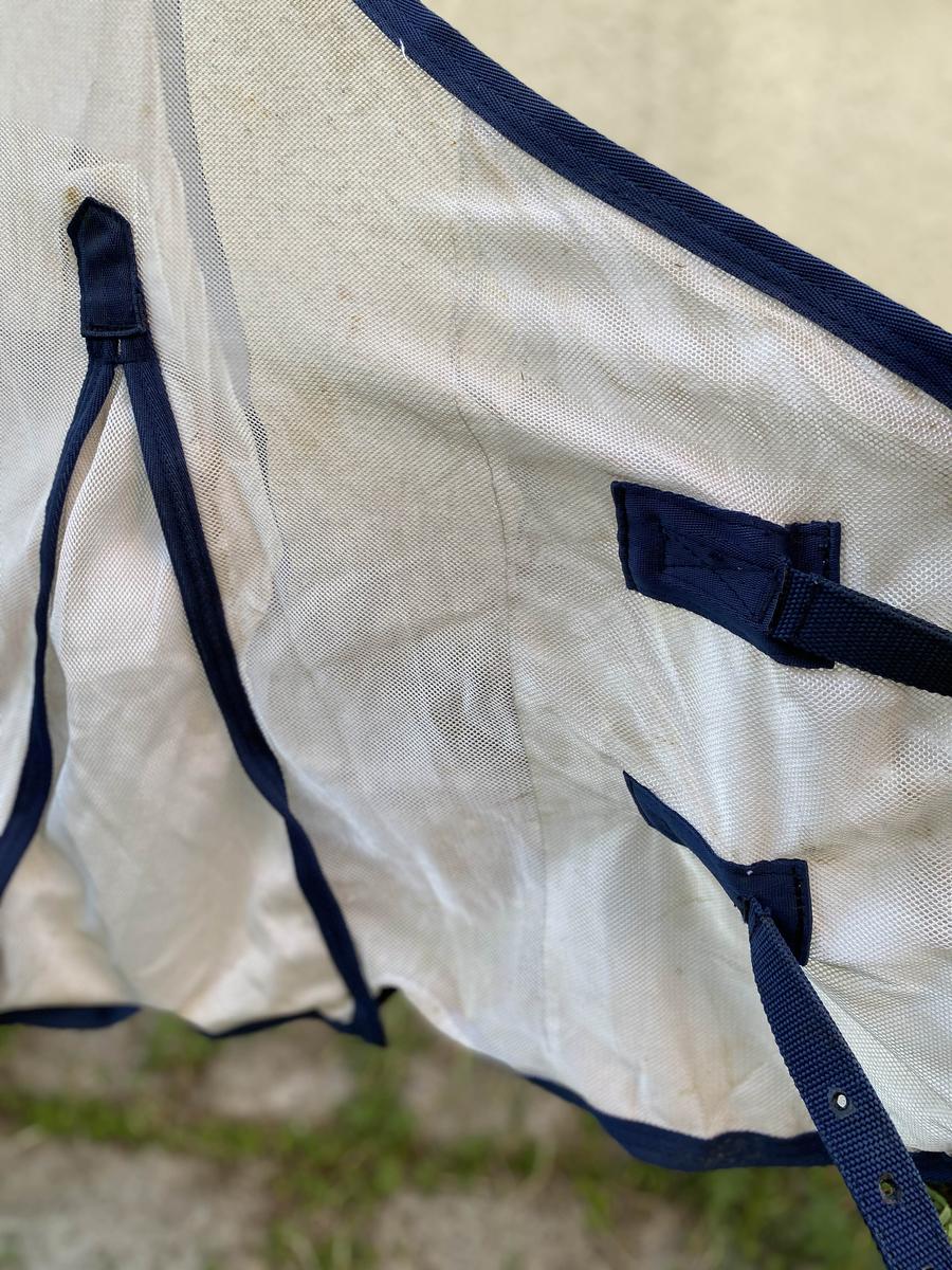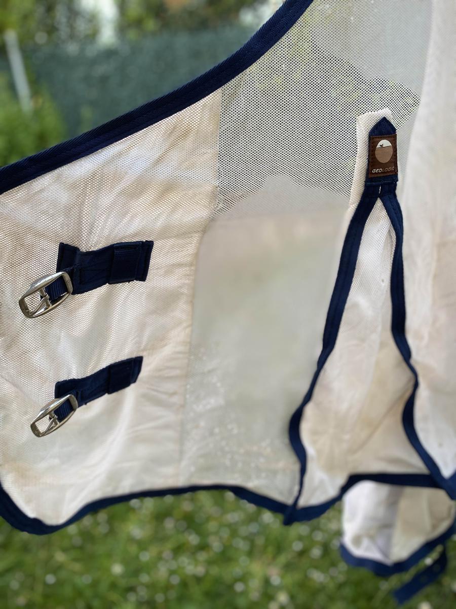 Couverture anti-mouche,géologique, taille 145cm. Pas mal servie mais reste en très bon état mis à part les quelques trous, mais qui ne gêne pas l’utilisation les mouches n’arrive pas rentrer. La tache sur la croupe ne part pas malgré de nombreux passages en machine. Possibilité de rajouter des courroies de cuisses et un protège cou, si besoin. Sera lavé avant envoi. Plus d’info et de photo en mp.