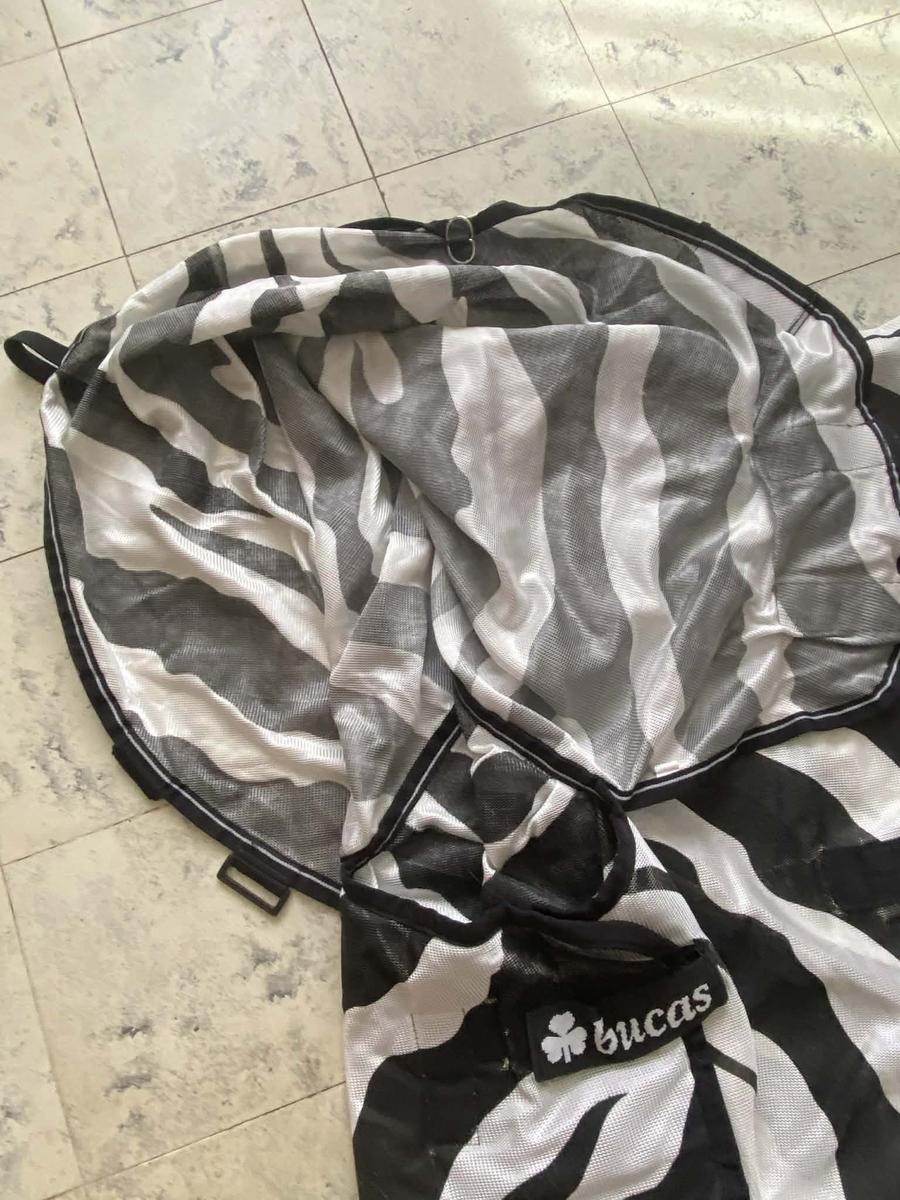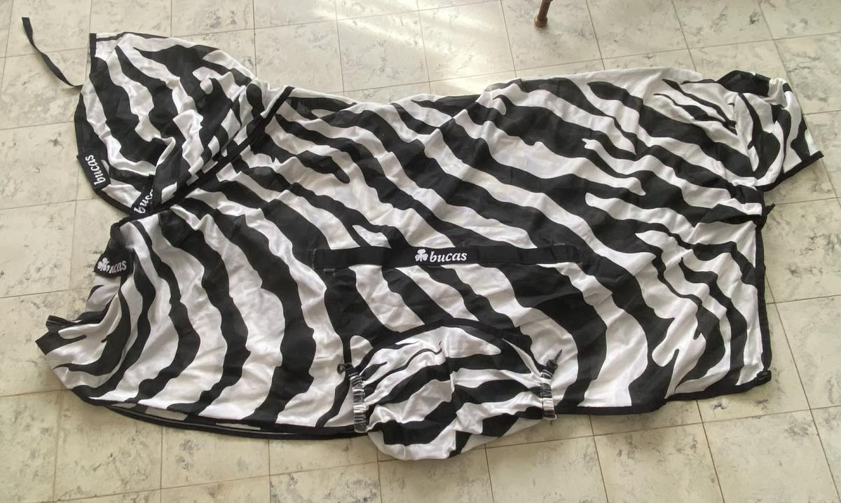 Couverture anti-insectes Bucas Buzz-off Zebra avec couvre-cou intégré. Très bon état, peu servie. Vendue à regret car mon cheval a du passer en "big neck".
