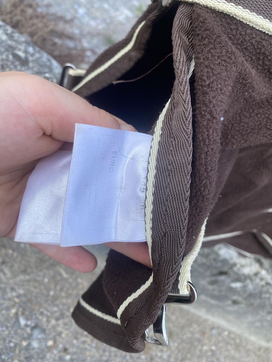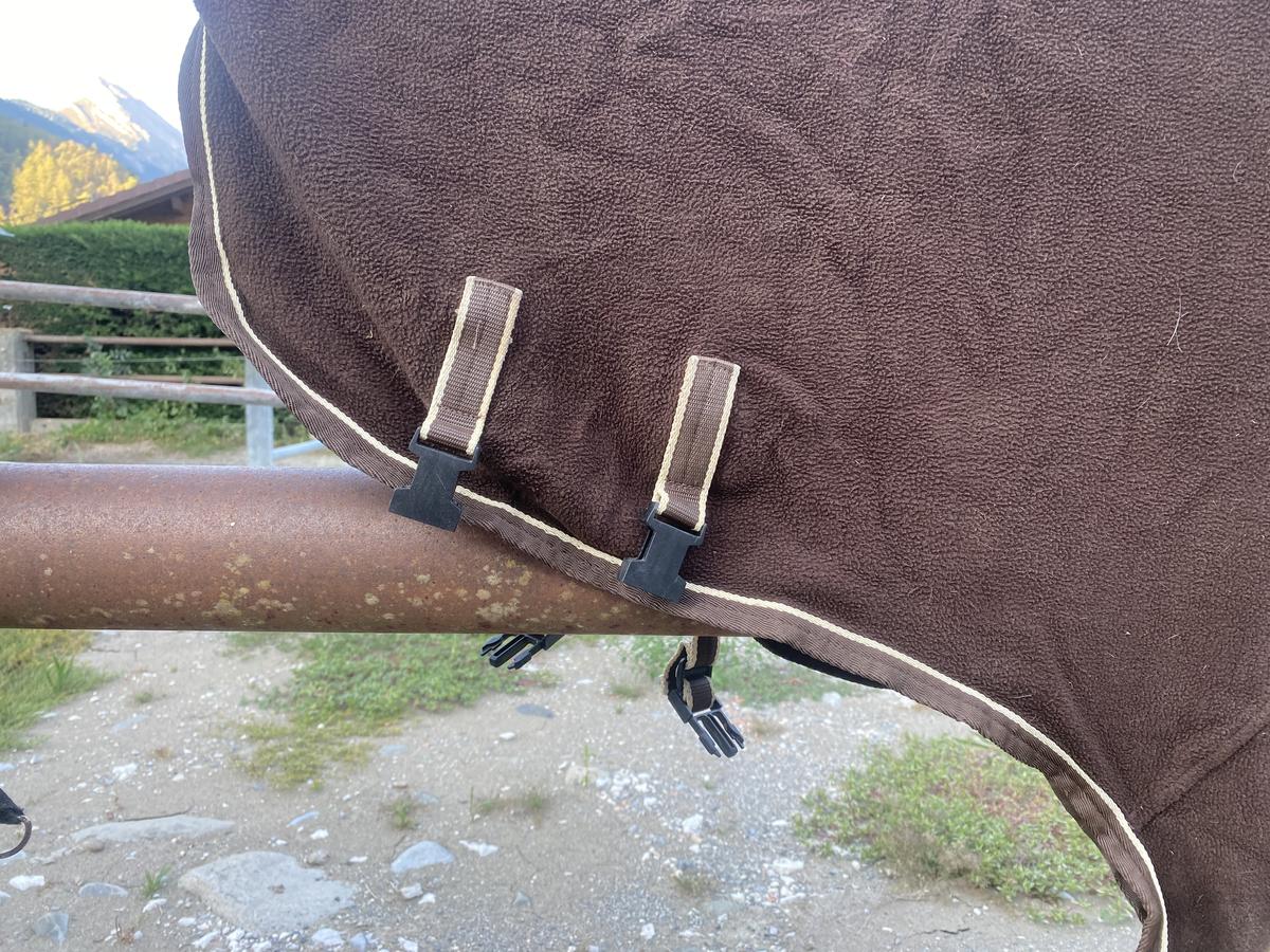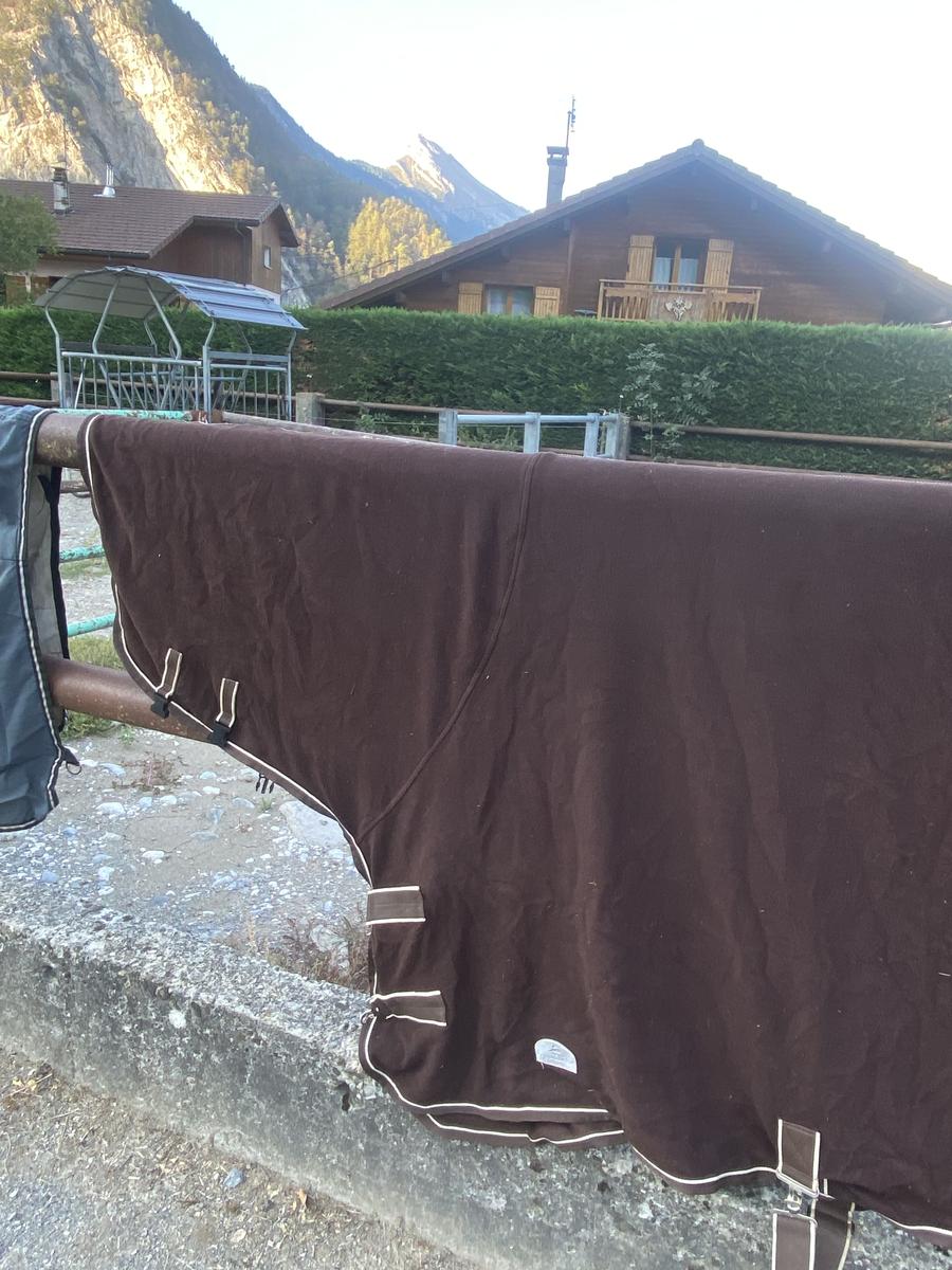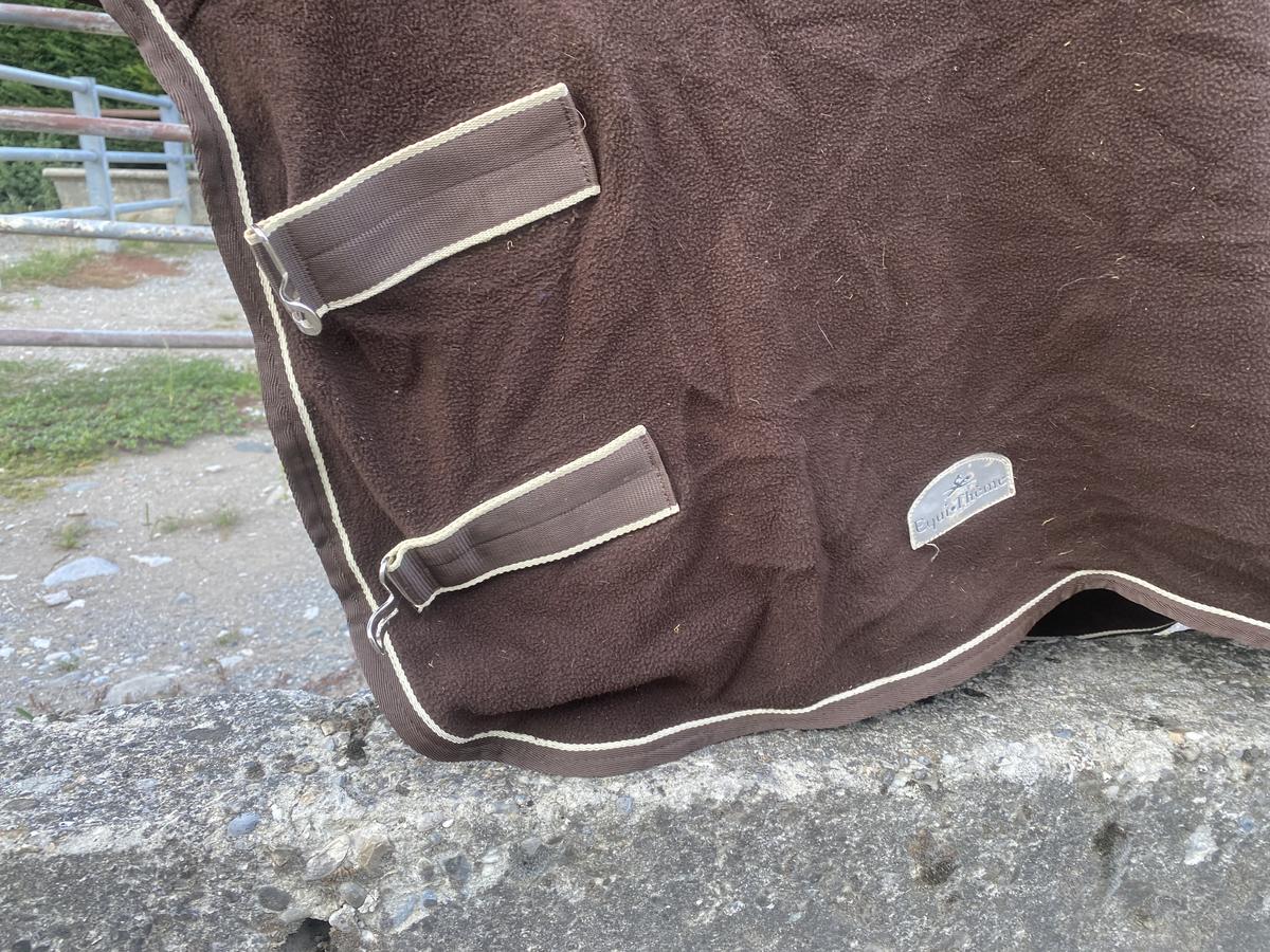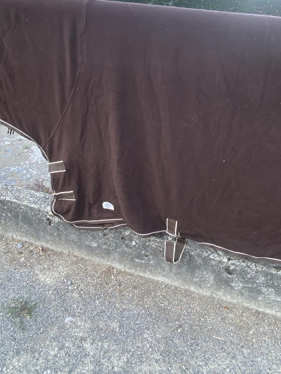 Couverture polaire equitheme marron intégrale avec couvre cou. Très peu servie donc très bon etat mis à part l’usure normal des attache un peu de rouille.