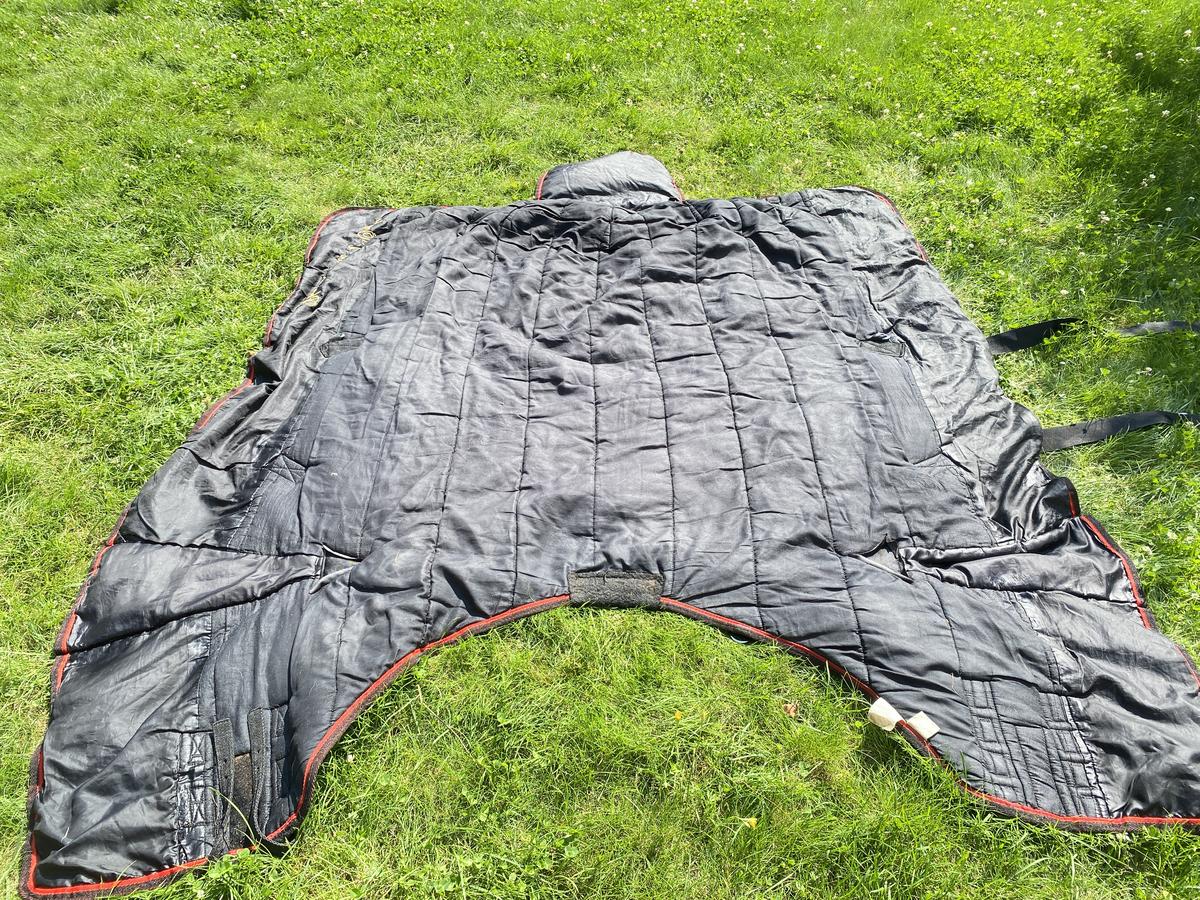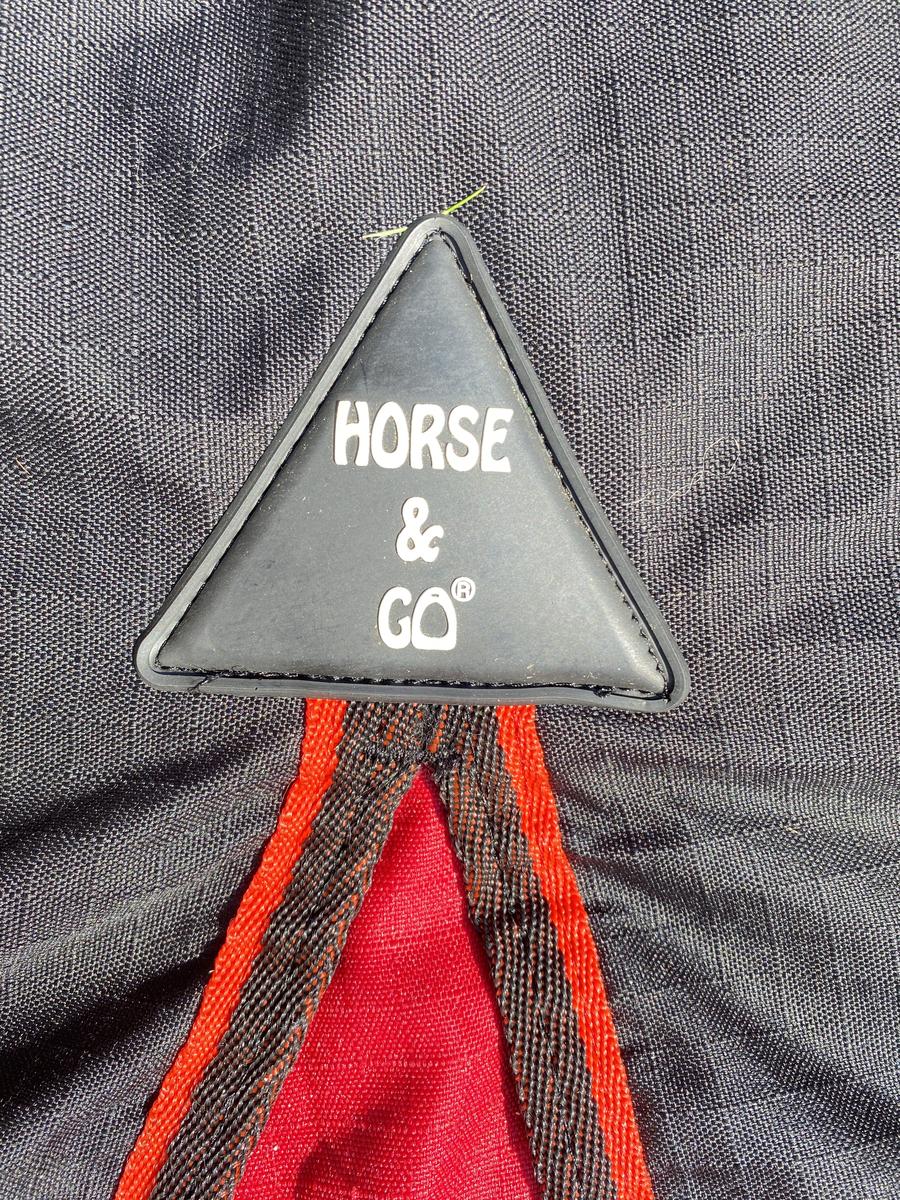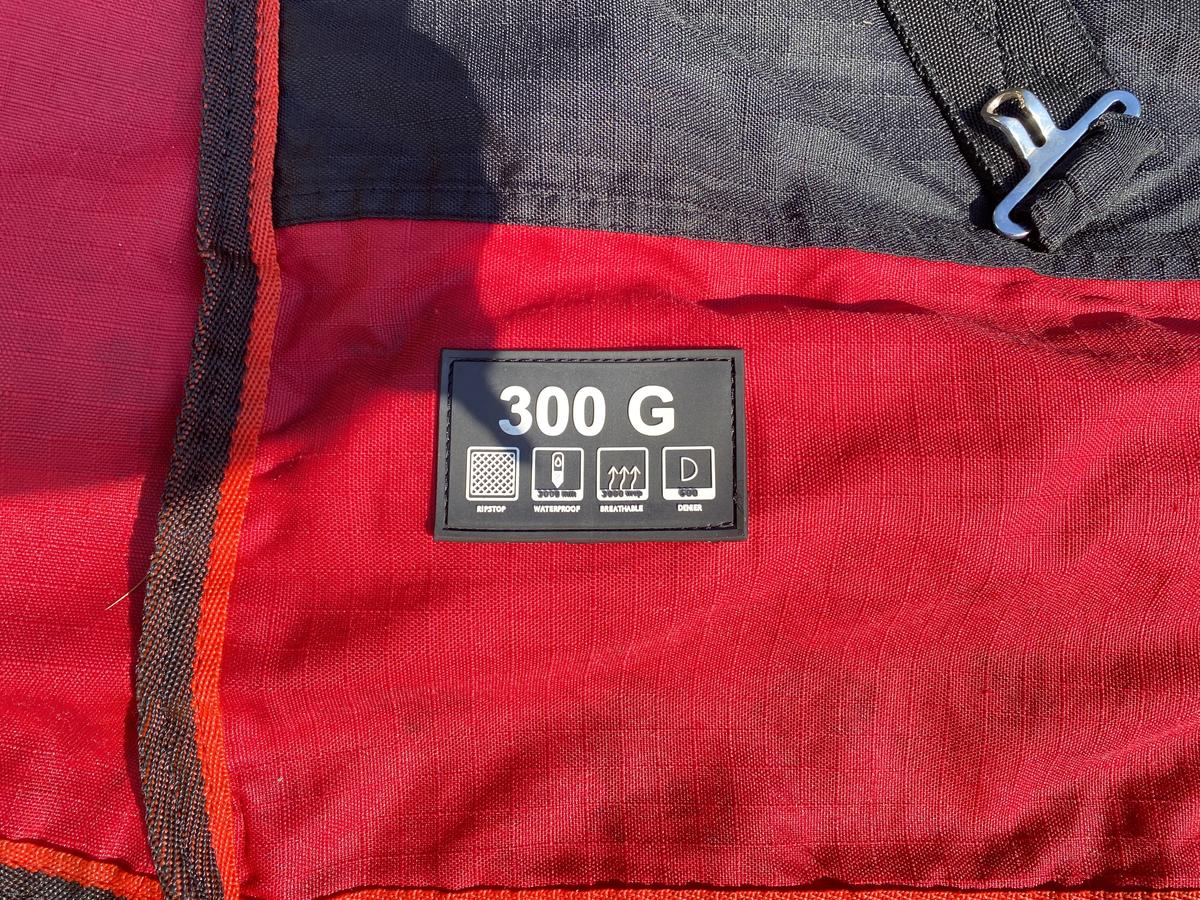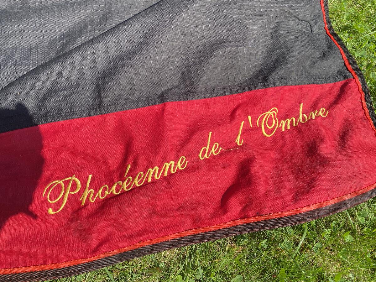 Couverture 300G imperméable 135cm-145cm (chevaux). Très bon état mais a une déchirure qui aurait pu être mieux recousue. Possibilité de débroder l'écriture.