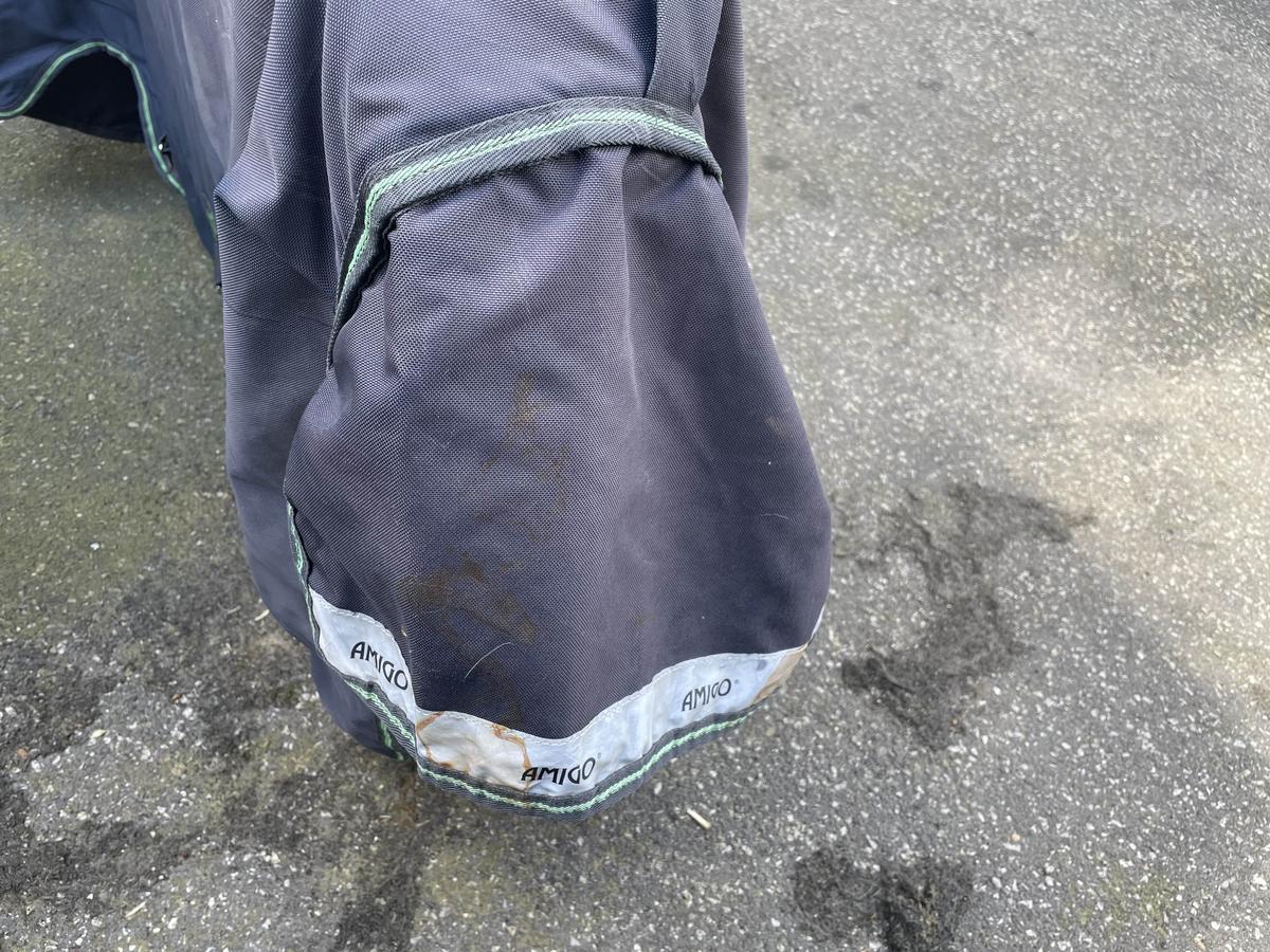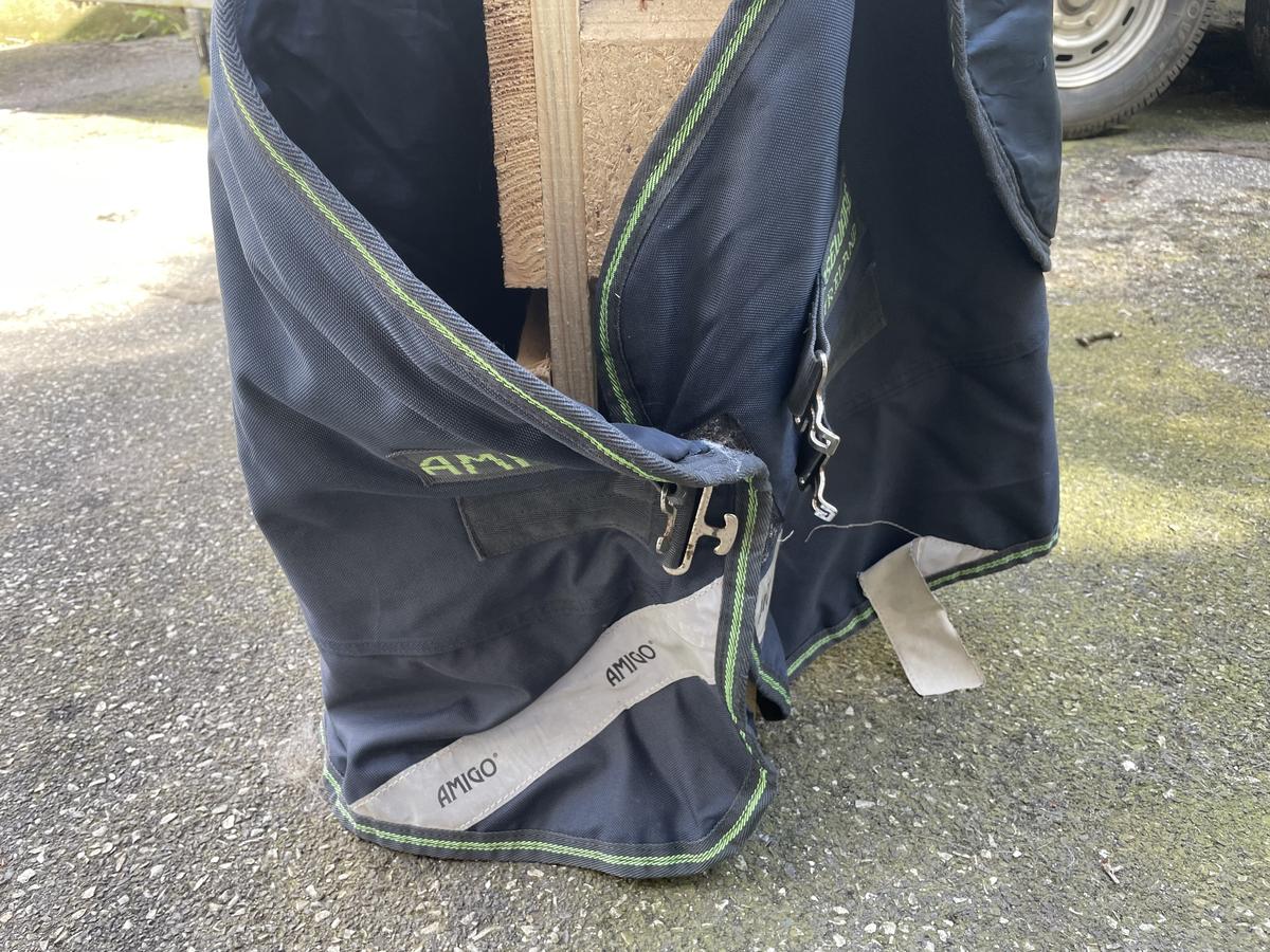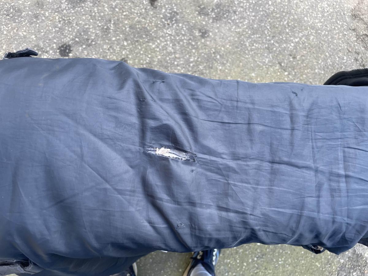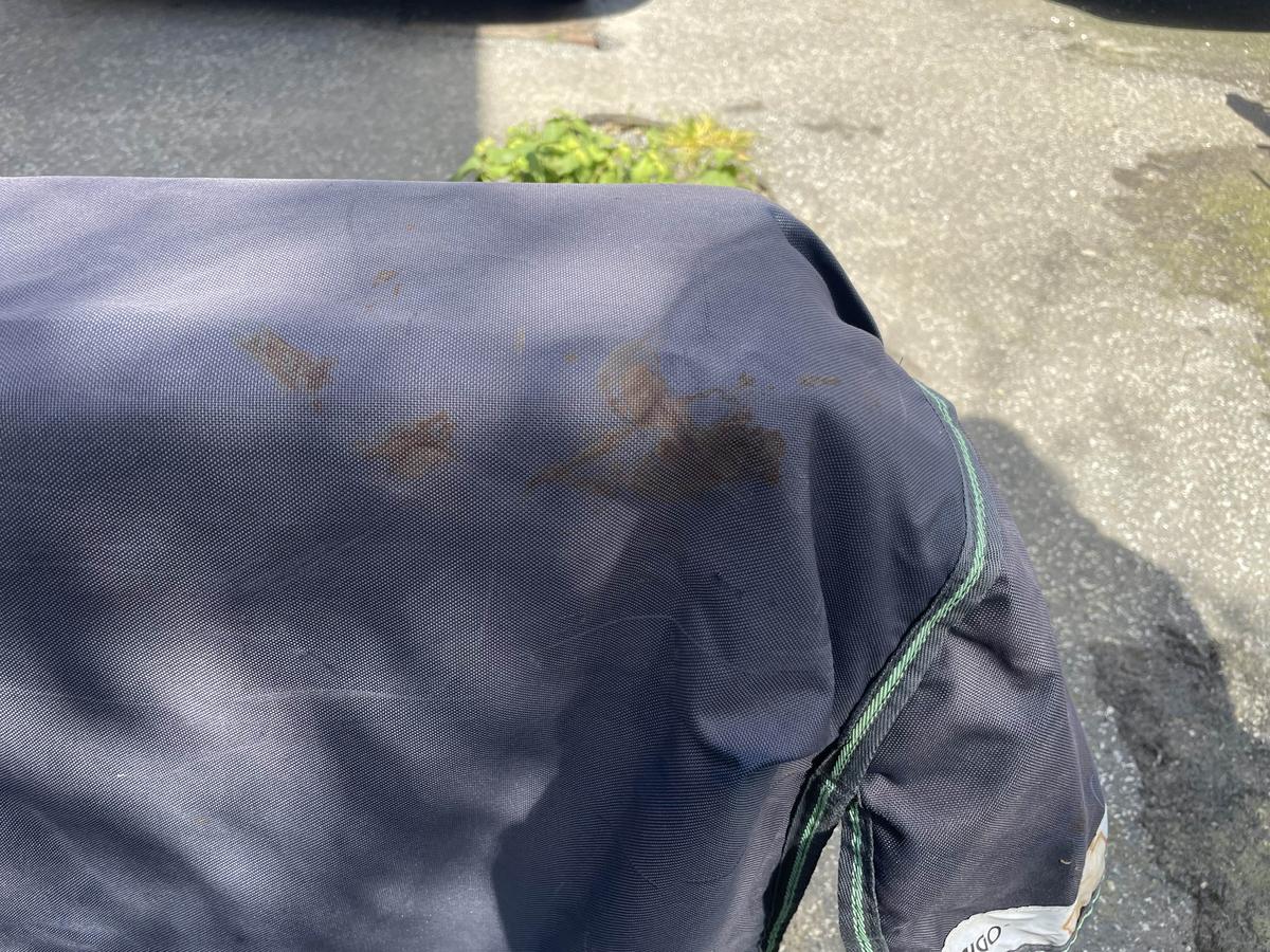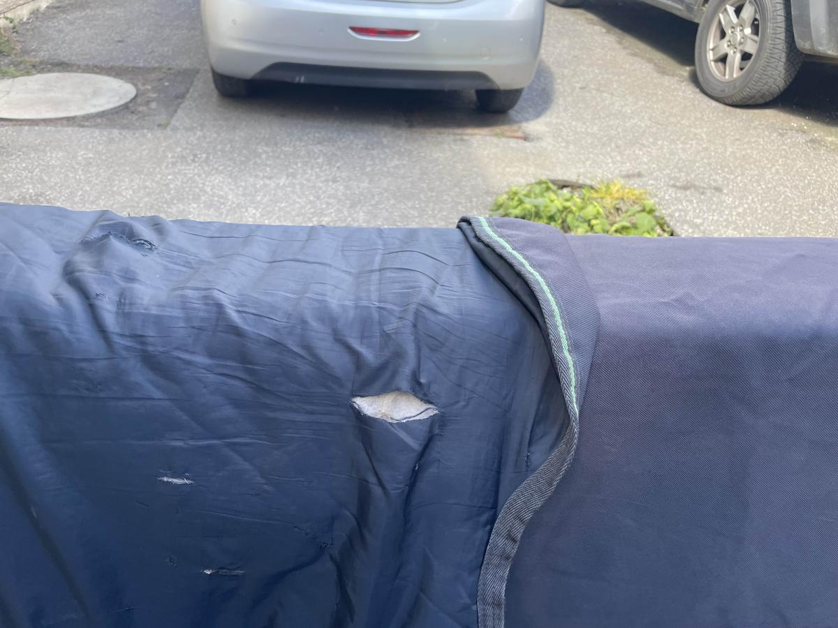 Couverture abîmé avec 2 déchirure à l’intérieur d’environ 3cm ( voir photo ) sur le couvre cou et sur la couverture des taches qui ne parte pas à la machine et une languette réfléchissante déchirée sur l’avant