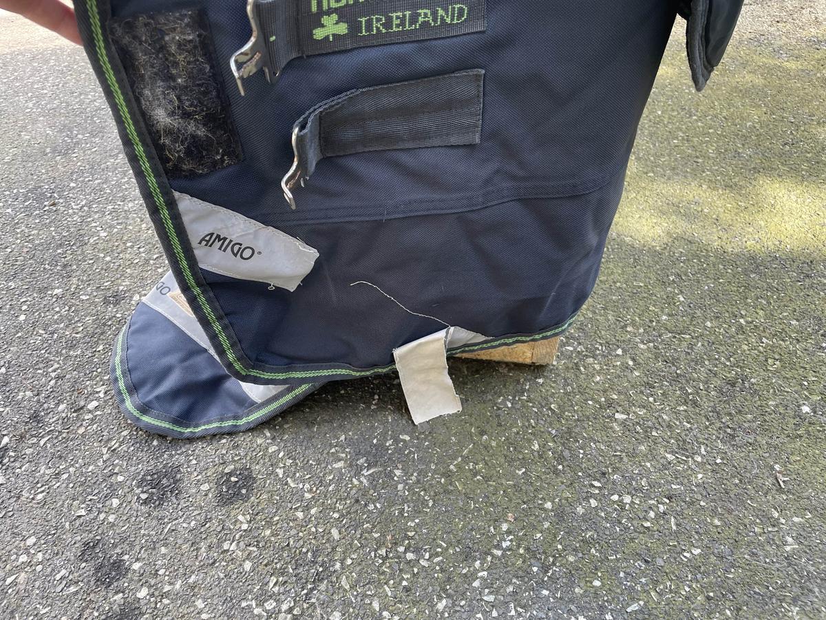 Couverture abîmé avec 2 déchirure à l’intérieur d’environ 3cm ( voir photo ) sur le couvre cou et sur la couverture des taches qui ne parte pas à la machine et une languette réfléchissante déchirée sur l’avant
